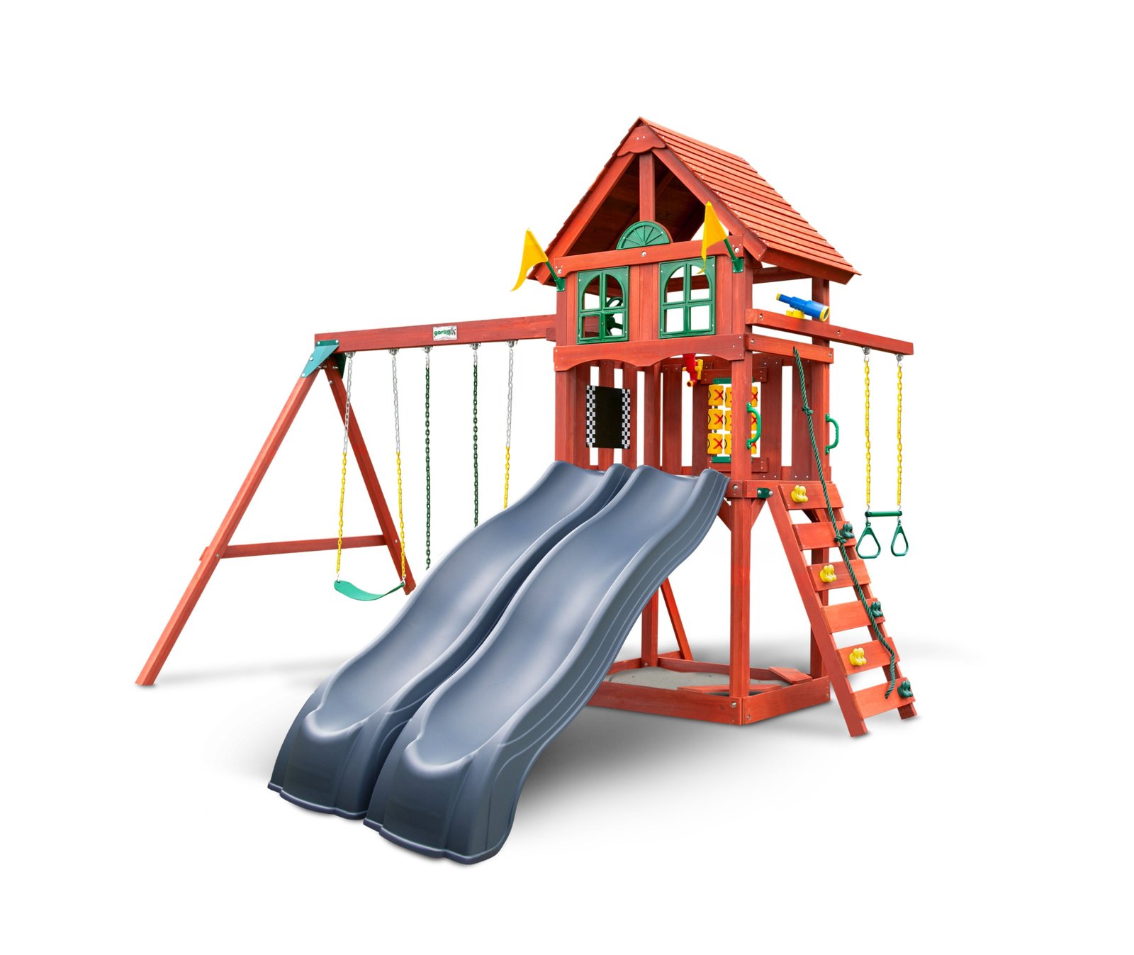 It’s time to have fun on the double with the Adventure Wave Swing Set from Gorilla Playsets. This set includes two times the features like two Alpine Wave Slide™, two swing beams for more swing options and a combination ladder and Rock Wall with Climbing Rope. Not only that, but it comes with both a Play Telescope and Periscope. Two great ways for kids to scope out the backyard!