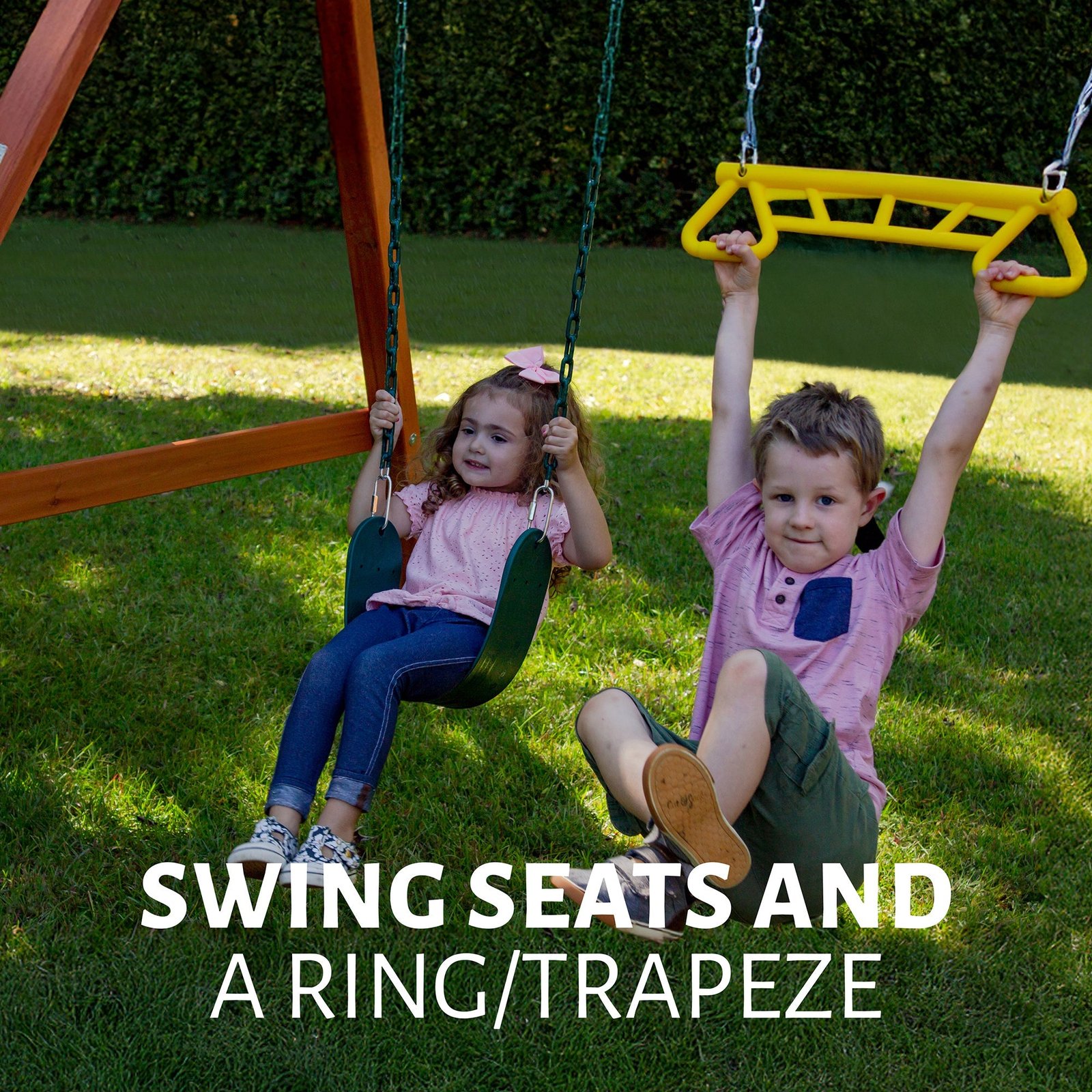 Quick! What’s an affordable way to have classic fun in your backyard? Install the Basic Swing Set from Gorilla Playsets and you’ll find out! With two Swing Belts, gymnastic ring/trapeze combo, and a structure crafted from the highest quality cedar, your kids can spend years swinging into fun. With user-friendly instructions complete with detailed illustrations, you’ll find this easy-to-build set is assembled in a snap.