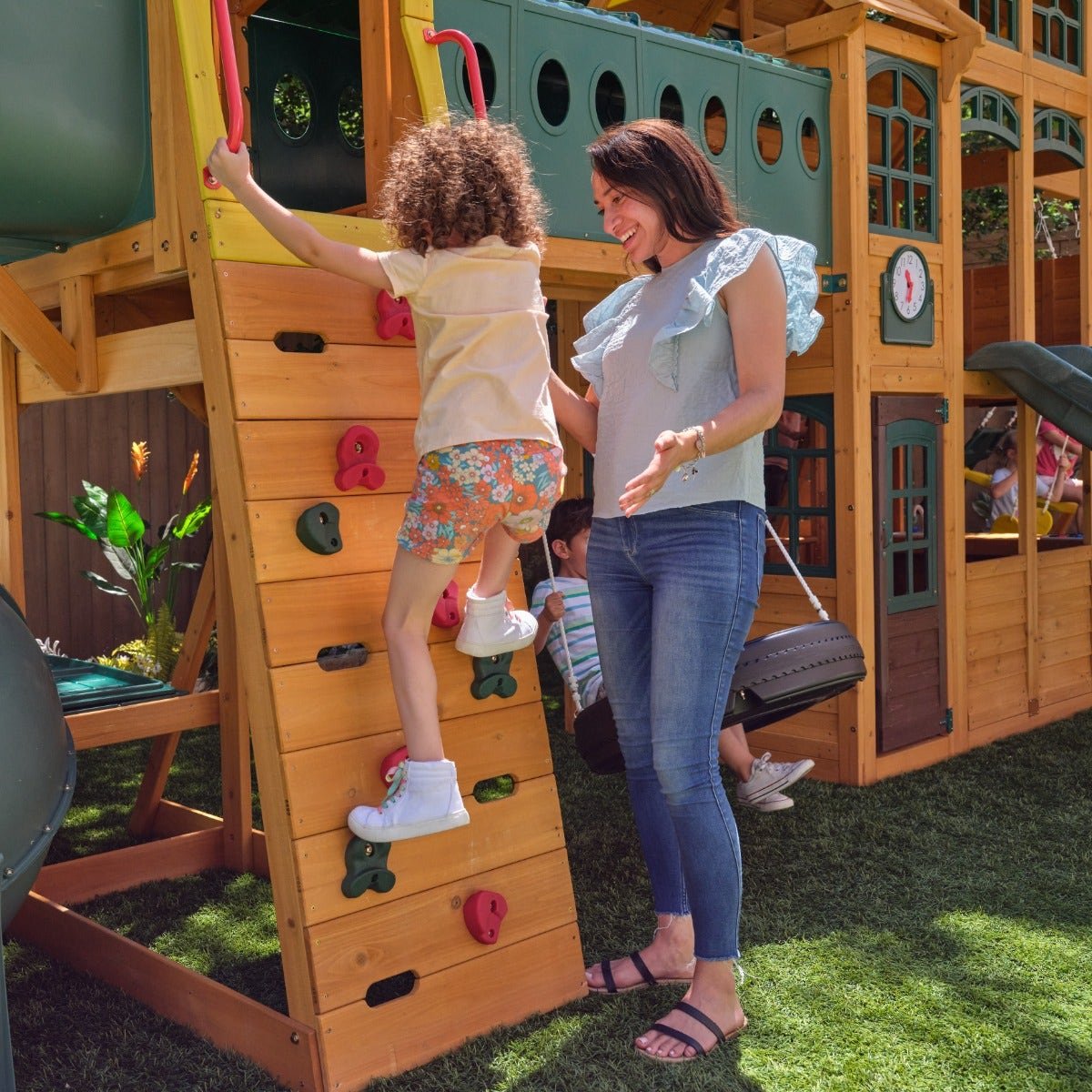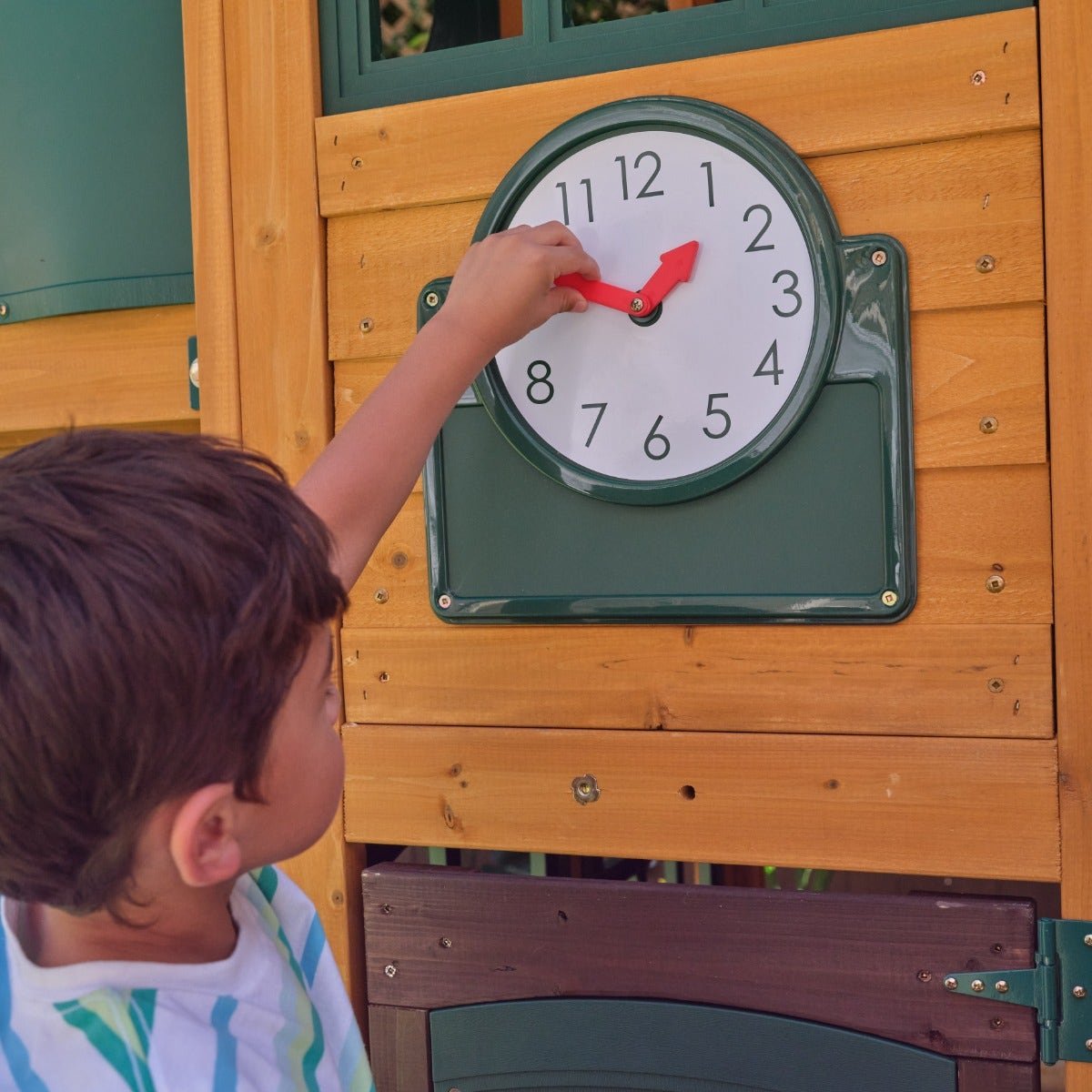Give your little cubs an extraordinary backyard experience to climb, swing, slide and imagine all day long with the Bear Cave Lodge Swing Set / Playset from KidKraft. Our largest swing set, it includes a clubhouse complete with door, kitchen, accessories and even a cafe window and bench! The second level offers up plenty of room for make believe play. Sliding down the double wave slides with a pal makes for friendly competition. Two rock ladders encourage extra exercise while the inviting tunnel is a fun way to crawl to the lookout tower for expanded adventures. There, kids will discover a telescope and twisty tunnel slide. For hands-on messes, let kids explore the sand/water station. Divided sections give kids individual spaces for ultimate creativity. So, set the moveable hands clock to “playtime” and let the excitement begin with the KidKraft Bear Cave Lodge Swing Set!