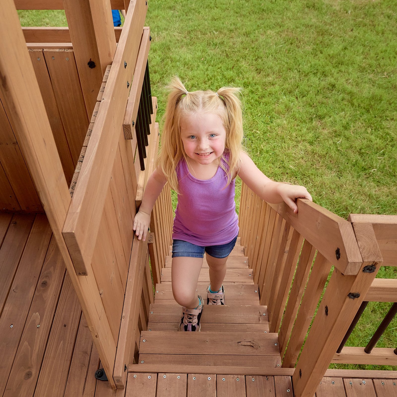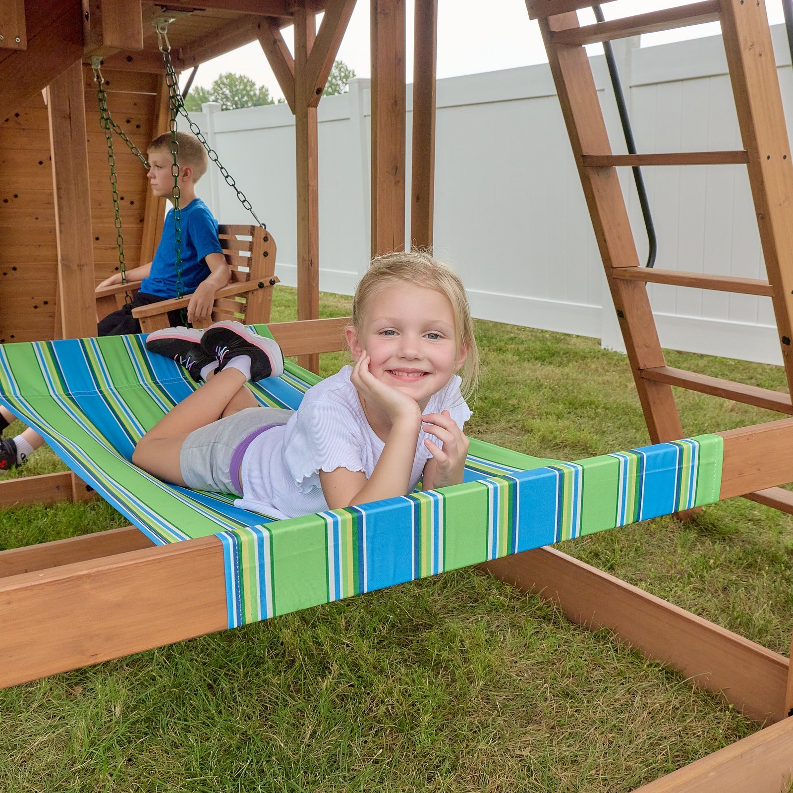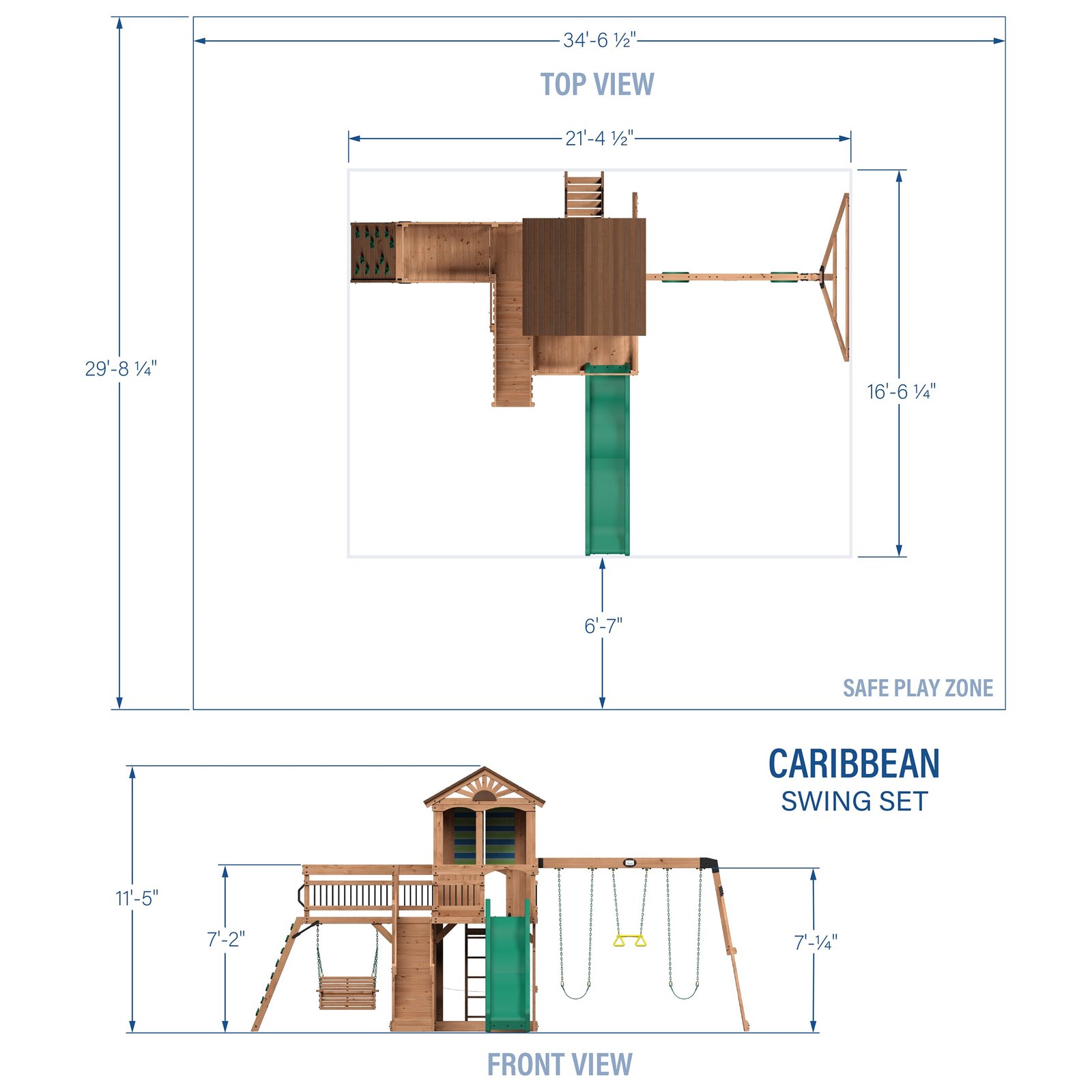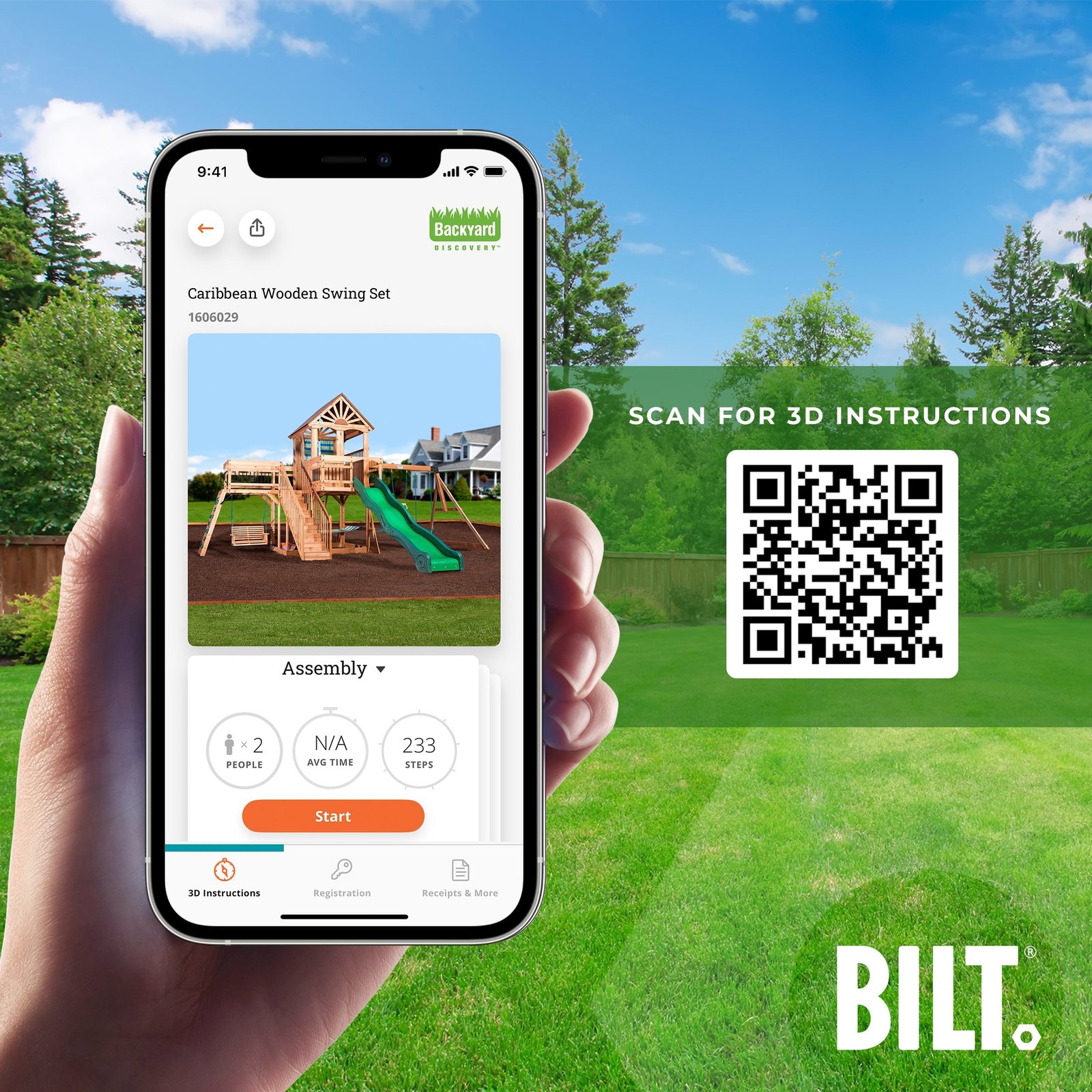 Create the ultimate home playground with Backyard Discovery’s Caribbean Swing Set, where beach house charm meets active outdoor play. The spacious upper clubhouse features a cabana-style retreat with its large window, flowing curtains, and inviting balcony. The staircase leads to the connecting deck and balcony, providing plenty of room for imaginative play. Adventurous climbers can tackle the rock wall for an exciting route to the upper deck, while the shaded hammock and cozy bench swing below provide the perfect spot to take a break from all the action. The large speedy wave slide offers thrilling rides, while two classic belt swings and a trapeze bar invite endless outdoor fun. This wooden swing set thoughtfully combines climbing, swinging, and sliding elements to create a complete outdoor playground right at home. Keep track of memories with the built-in growth board that marks childhood milestones. Every detail is designed to spark imagination and encourage active play while maintaining a stylish coastal aesthetic. With a ready-to-assemble design and guided instructions through the interactive BILT® app, you can build your kids swing set kit in no time. The Caribbean Swing Set transforms your backyard into an island-inspired play retreat where memories are made every moment.
