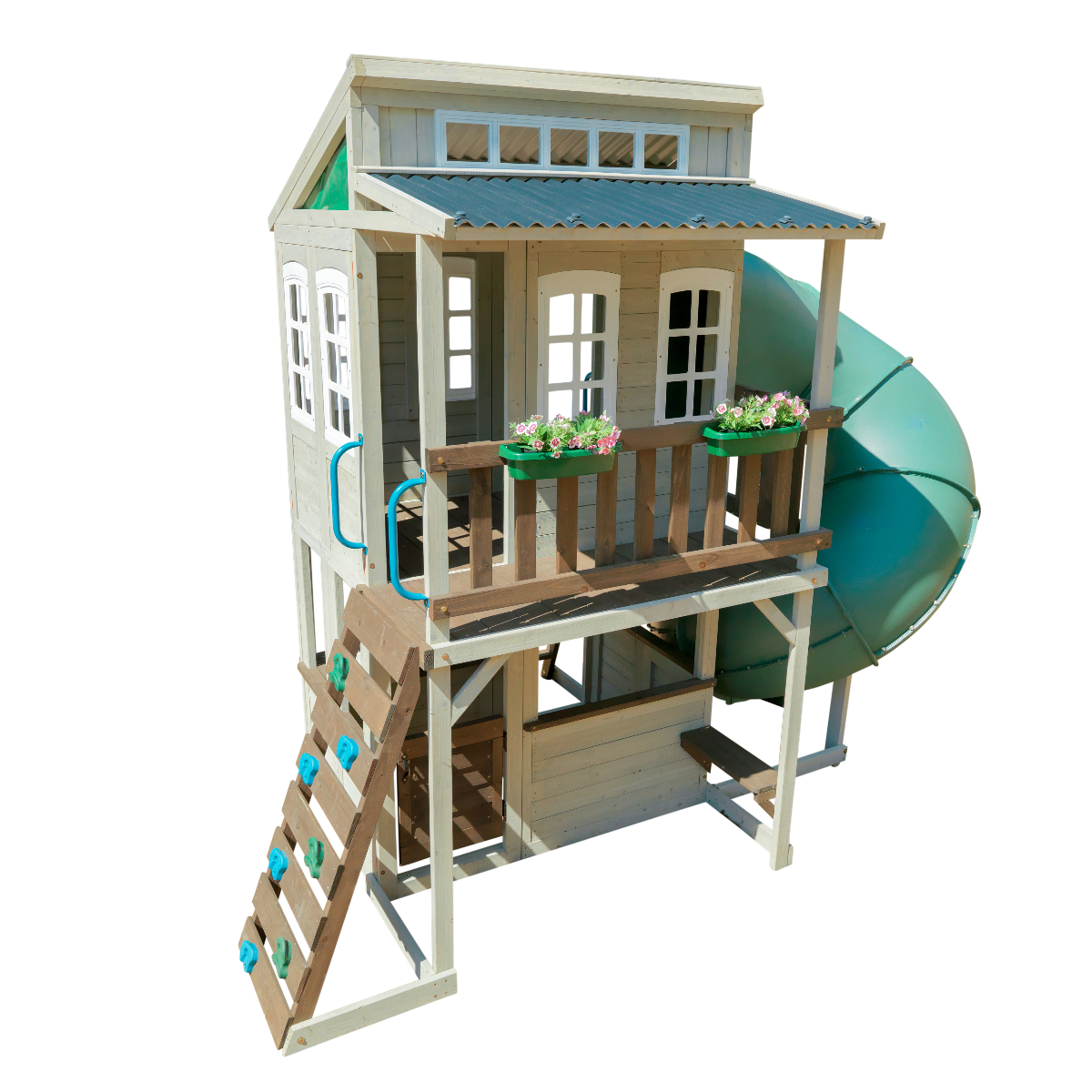 Want to have the coolest clubhouse around? The KidKraft Cozy Escape Playhouse is a double-decker structure that’ll entertain kids all day. The lower level has two entrances, a sink and play stove. In front is a covered area complete with bench and cafĂ© window. Clamber up to the top via either the side or back ladder. An abundance of windows ensures there’s tons of light. The deck includes a couple of planters for growing flowers, herbs or maybe even lollipops! When it’s time to get to the ground, this playhouse offers a thrilling alternative to stairs—a twist-n-ride tube slide! Magical memories will abound in this elevated play structure that lets kids use their imaginations in so many different ways. It’ll definitely be a “Cozy Escape” in the backyard for years to come.