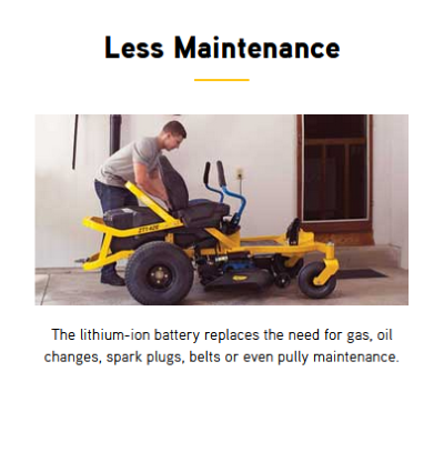 - No need for oil changes, filters to change, spark plugs to change, no more buying gas