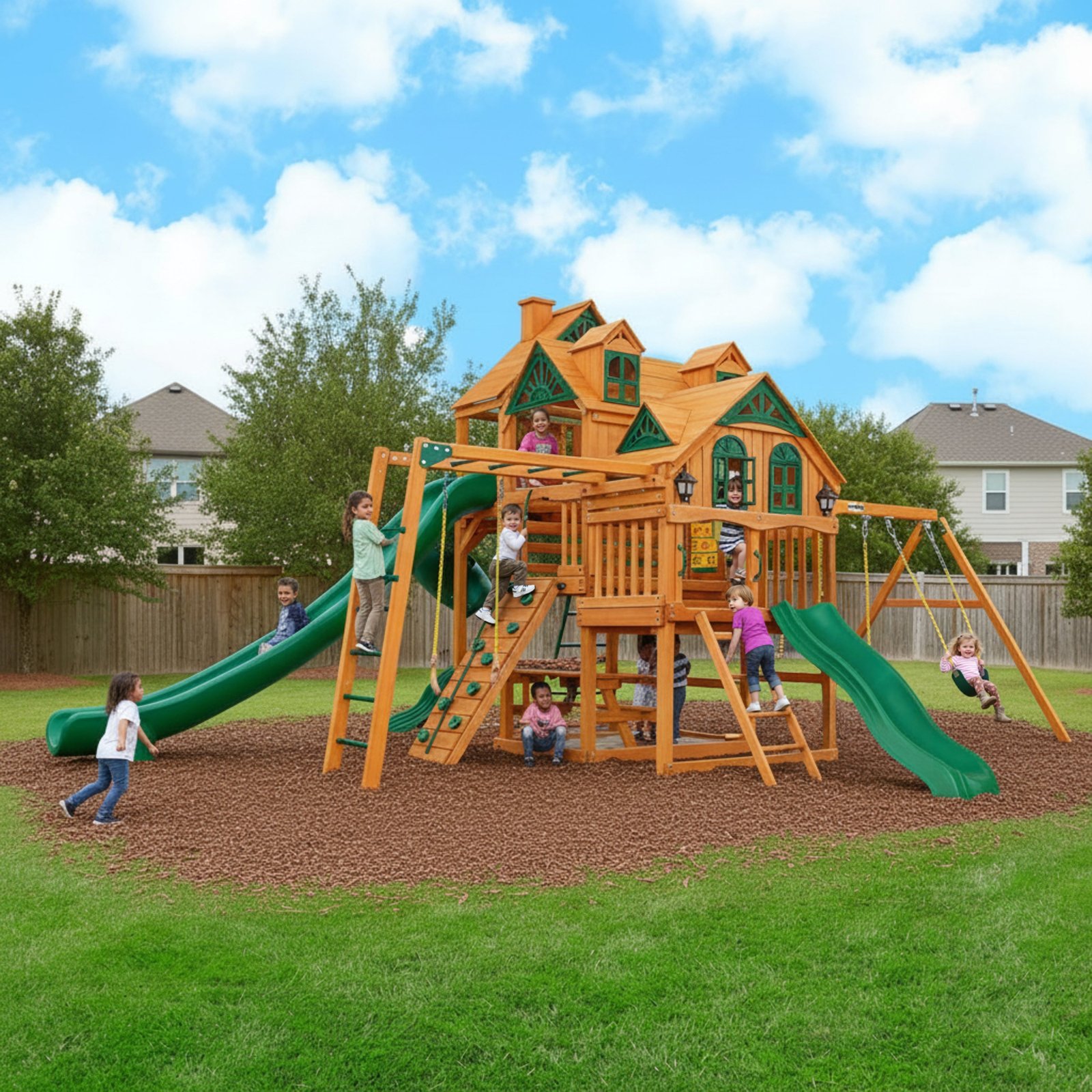 Having an Empire Swing Set in your backyard is sure to make you a hit with the kids. With all the fun features like Monkey Bars and an Alpine Wave Slide™, this set has it all! The THREE play decks are protected with Tongue & Groove Wood Roofs and include two solar wall lights. The entire playset is finished in a beautiful amber stain. Let the fun begin, order yours today!