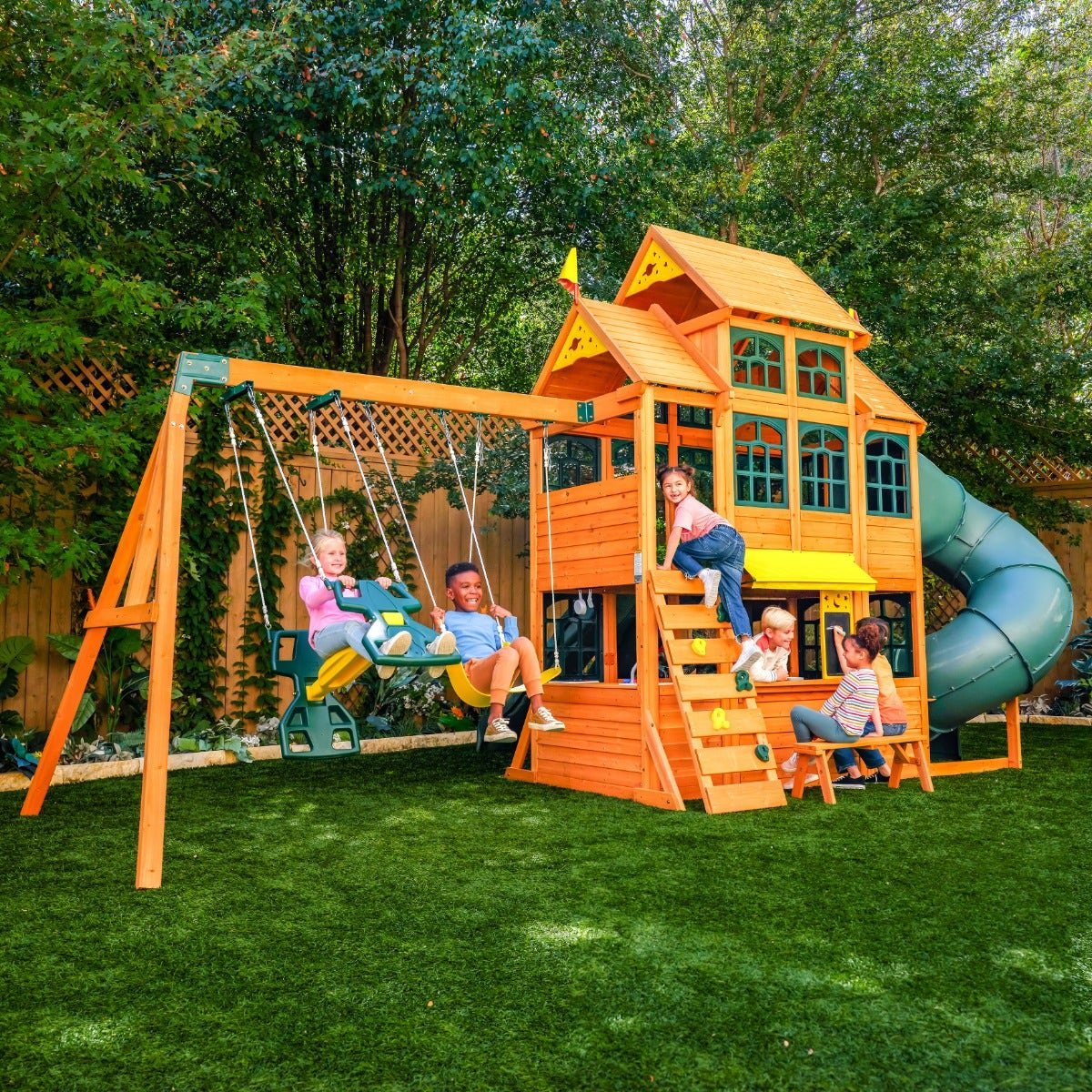 Kids’ playset or Eighth Wonder of the World? The Falcon Ridge Swing Set by KidKraft is just that awesome. So awesome, in fact, it’s capable of keeping up to 13 energetic kids busy and happy. For starters, Falcon Ridge features three amazing slides—two high-rail wave slides for racing side by side and one thrilling 12-foot Twist-n-Ride tube slide. The excitement continues with a multi-colored rock wall that leads to the spacious upper clubhouse (perfect for secret meetings). Downstairs, a deluxe play kitchen with stovetop, sink and accessories delights future chefs. Plus, there’s a double-sided chalkboard for writing out daily menus. A large cafĂ© window and moveable bench are just right for serving snacks to your friends and family. And when the clock with moveable hands says it’s time to go, a quick dash to the belt swings or two-person glider starts a brand new adventure. The full two-level structure is like having a playhouse and swing set in one, right in the comfort of your own yard. Crafted of premium wood with a child-friendly stain, Falcon Ridge delights all with its shiplap roof, decorative gables and rounded arch windows. A true wonderland of fun without ever leaving home.