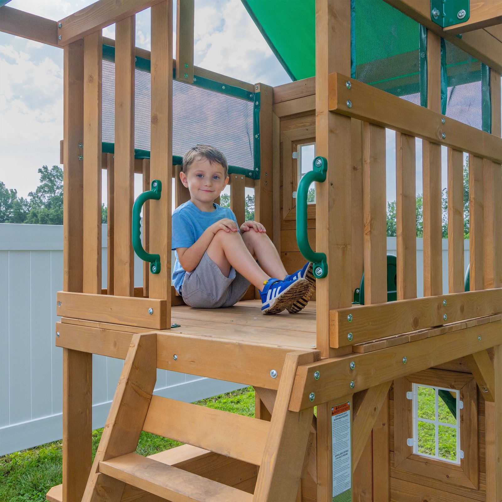 Kids can playfully explore and dream up adventures on the Fall River Swing Set from Backyard Discovery. Designed with upper and lower play areas, this wooden swing set features an elevated clubhouse complete with a canopy roof, creating the perfect hideaway where kids can plan their next quest. The lower play space is designed with a full front door, offering a welcoming spot that feels like their very own little home. A spacious side window designed with a snack bar becomes the perfect hang out spot where your little ones can serve up pretend treats or take refreshment breaks in between adventures. Kids can zoom down the 8-foot speedy wave slide, then soar toward the sky on two classic belt swings designed with rope chains that are gentle on little hands. Whether they’re pirates sailing the high seas or astronauts exploring space, this backyard swing set transforms your yard into their favorite play space. Built from robust Nordic spruce and finished in a light brown stain, this playset brings natural charm and exceptional durability to your outdoor space. The Fall River Swing Set by Backyard Discovery is designed to inspire creative play through years of growth, imagination, and sky-high adventures.