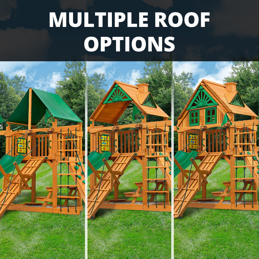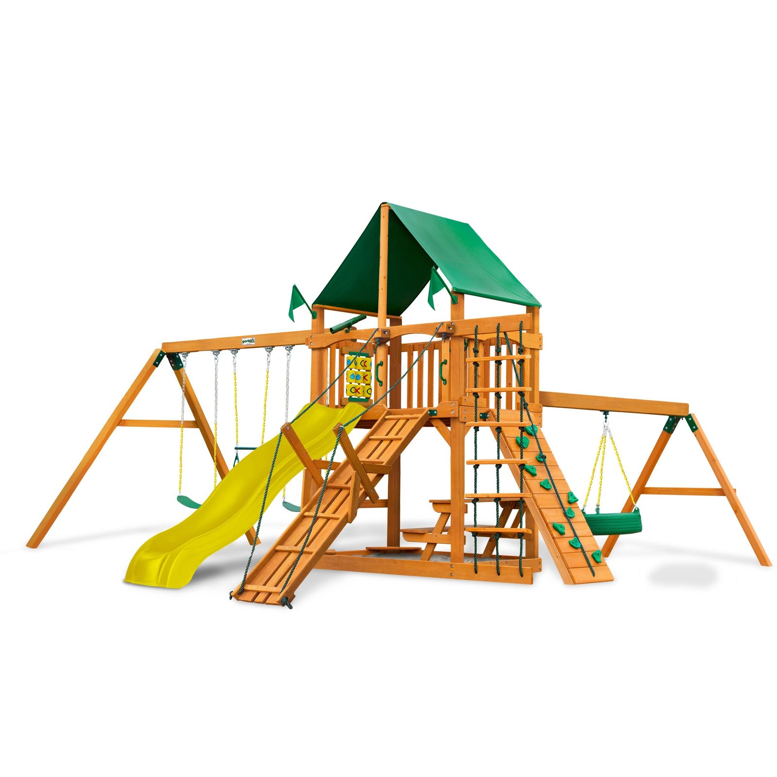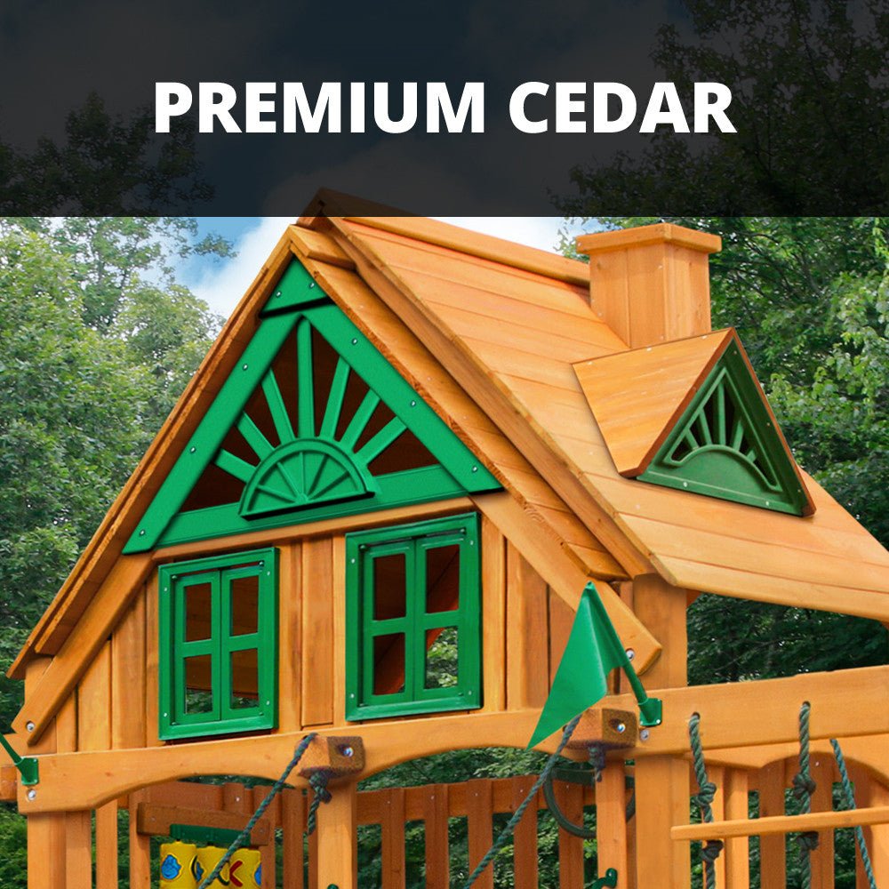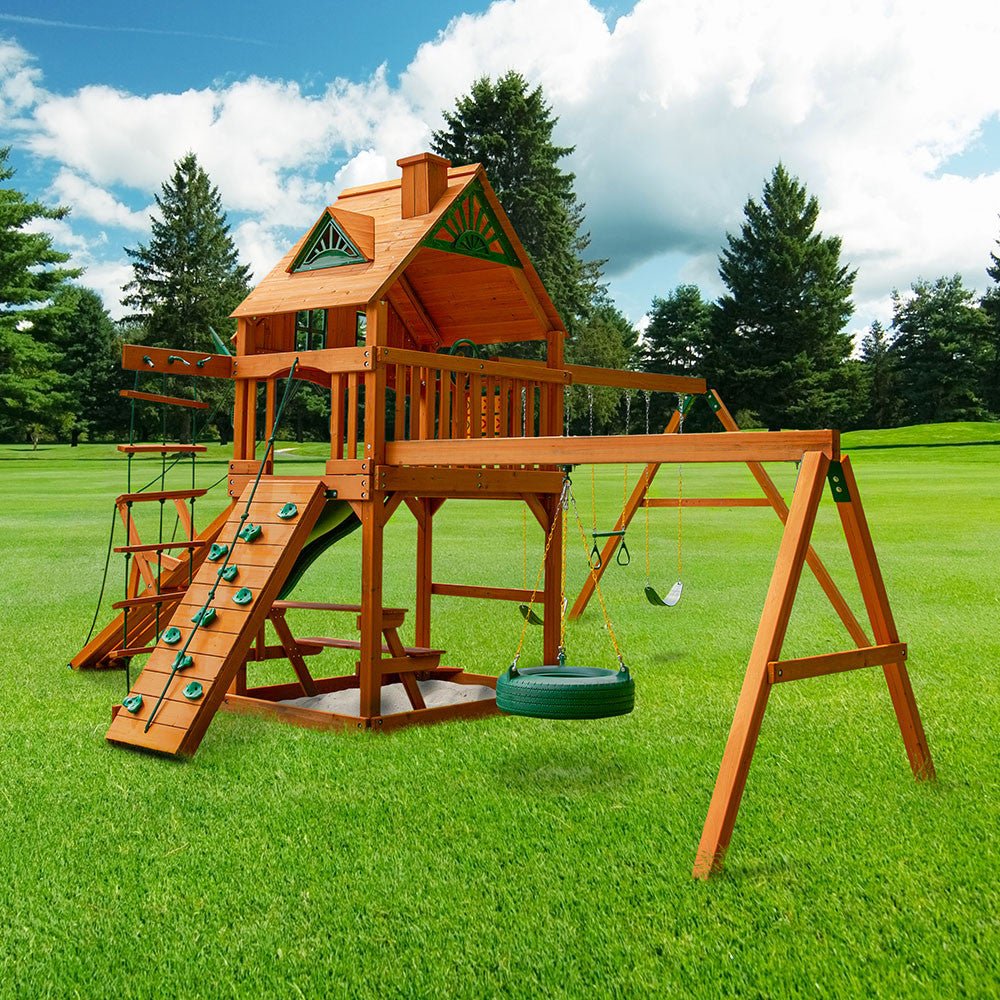 Your kids will be exploring new worlds with the Gorilla Playsets Frontier Swing Set. The set includes four swings on two different swing beams – two traditional belt swings and a trapeze swing on one and a tire swing on the other, with room to move! The Alpine Wave Slide™ makes it easy to get down in a hurry when it’s time to go in. Kids will have a great time climbing the rock wall or climbing ramp. There are safety handles to aid in climbing to the upper deck. It is built out of sturdy wood, so it will hold up to whatever your kids want to dish out! The main beams and posts are available in Natural Cedar. Order yours today!