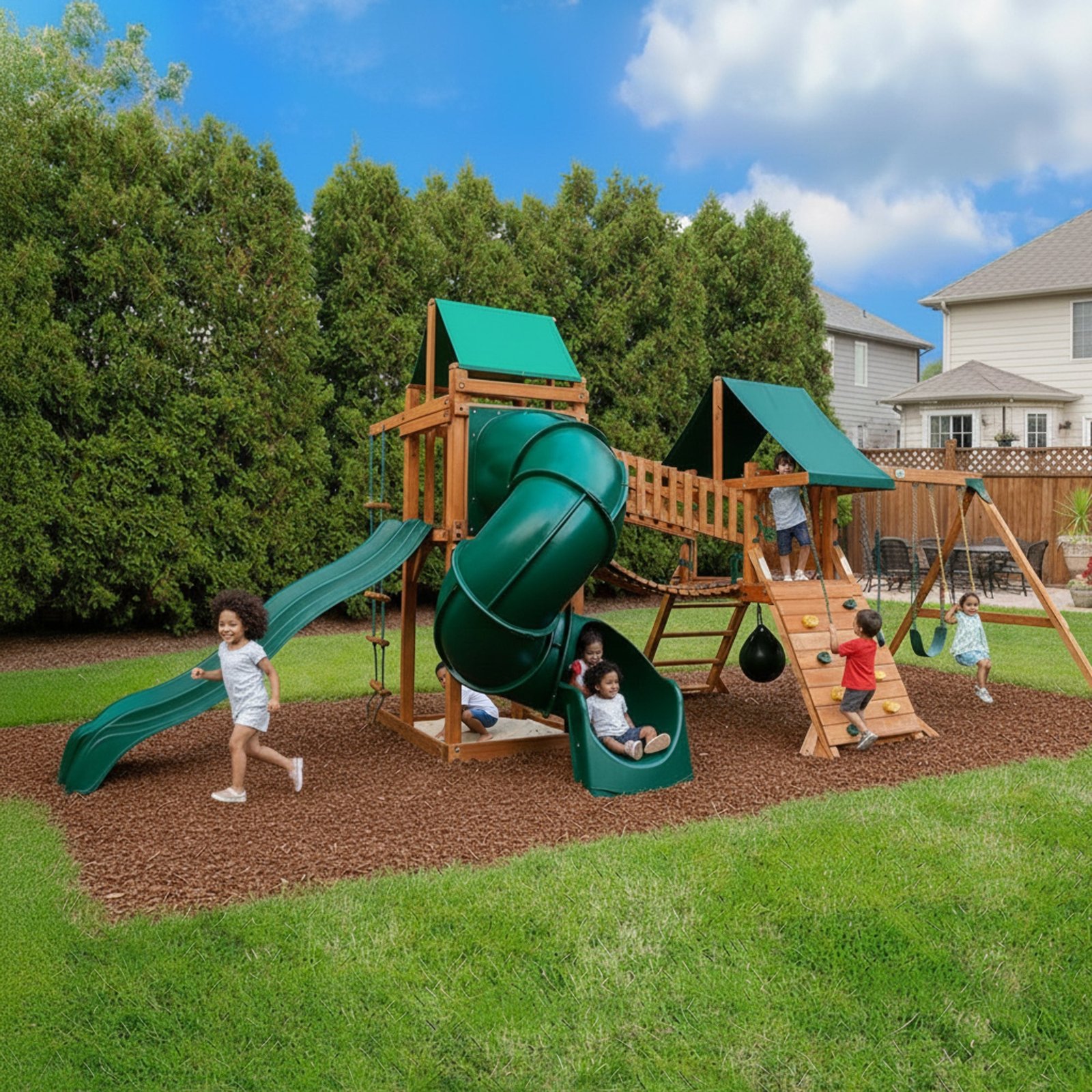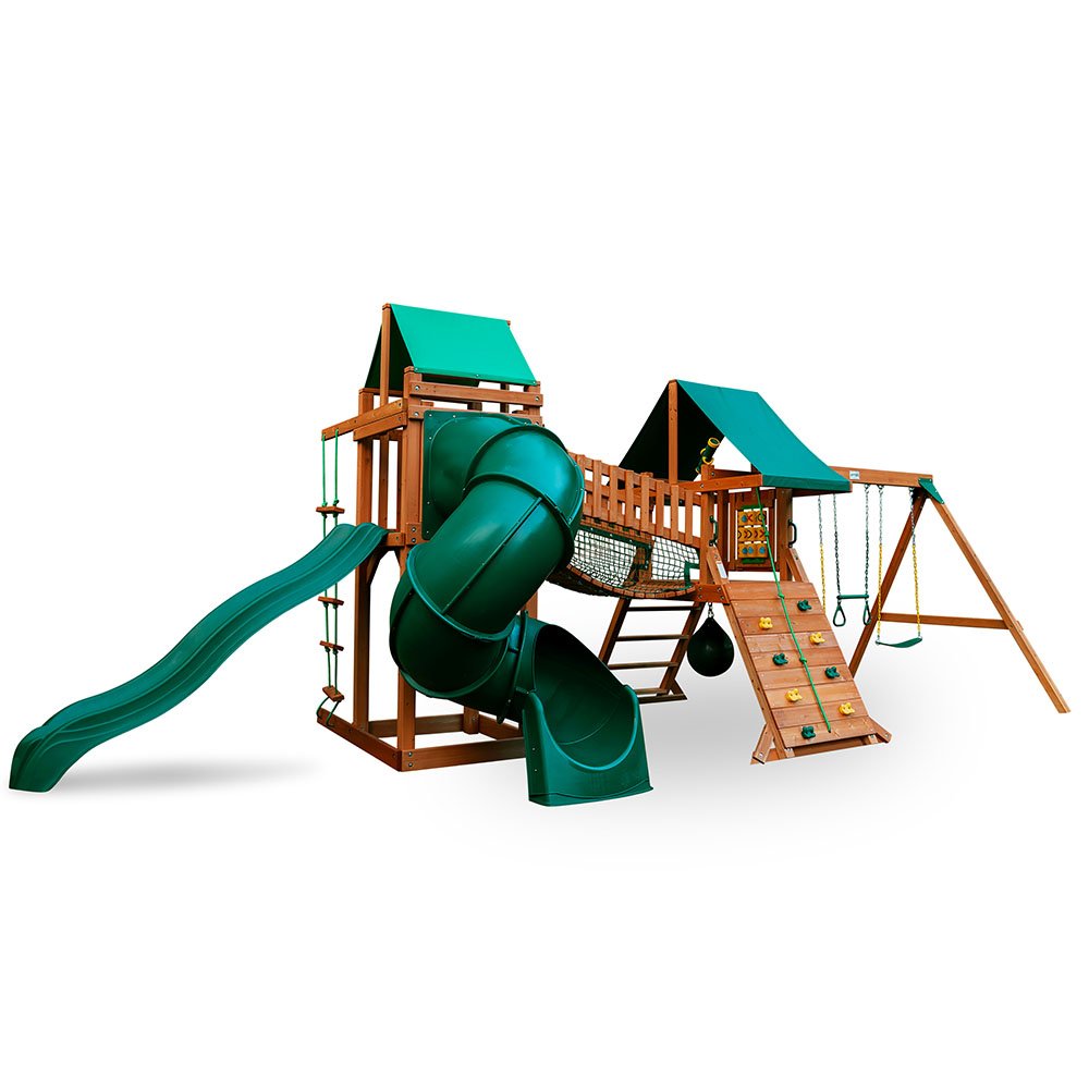 The green vinyl canopy over the decks provides shade and adds a pop of color, complementing the natural wood finish. Additional accessories, including a Wave Slide™ and various play features, ensure that there’s always something new to explore. The High Point Deluxe by Gorilla Playsets is more than just a swing set; it’s a childhood memory in the making, fostering play, exercise, and imagination in the safety of your backyard.