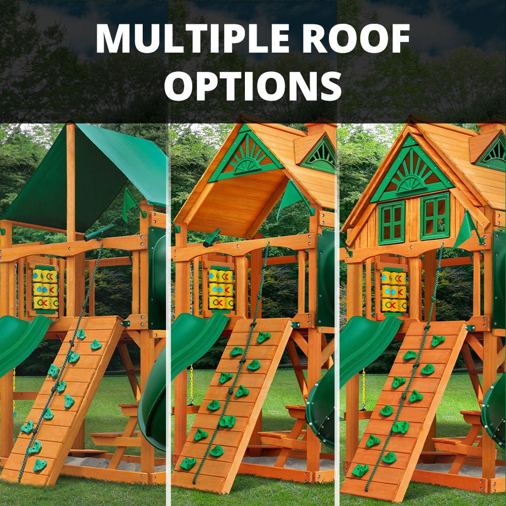COOOOL! That is the only word that describes the Mountaineer. Of course, it is loaded with great play features like the rock wall, Alpine Wave Slide™, built-in picnic table and so much more. Select from our wood roofs or green vinyl canopy.