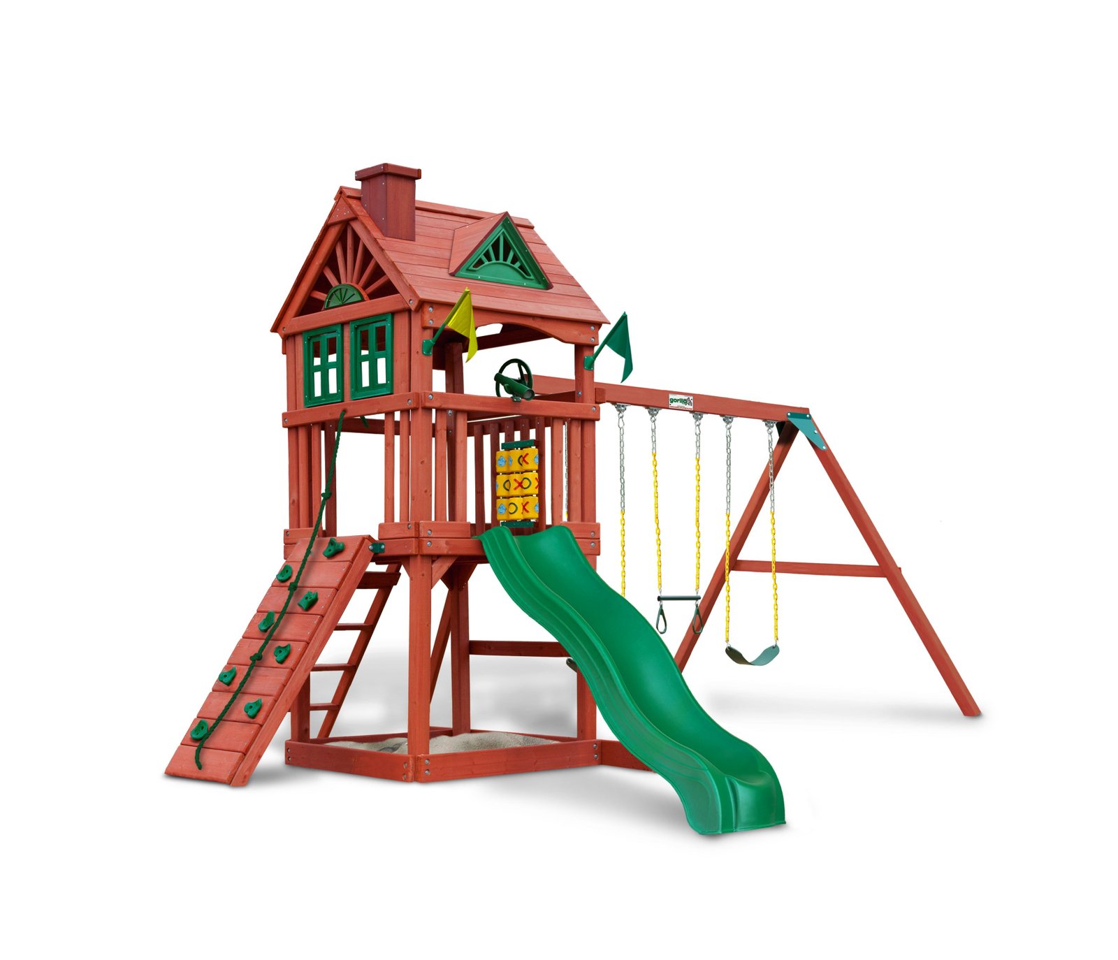 The Nantucket II Swing Set by Gorilla Playsets is a perfect swing set, complete with delightful features that children love! It has details like a real wood roof, a chimney and working shutters! Fun activities like a Wave Slide™ and a climbing wall create the setting for a perfect day of play! The entire playset is finished in a beautiful redwood stain. This premium cedar wood playset is pre-cut, pre-sanded, pre-stained and ready to assemble in your backyard. Gorilla Playsets’ cedar naturally resists rot, decay, and insect damage. Let the fun begin, order yours today!