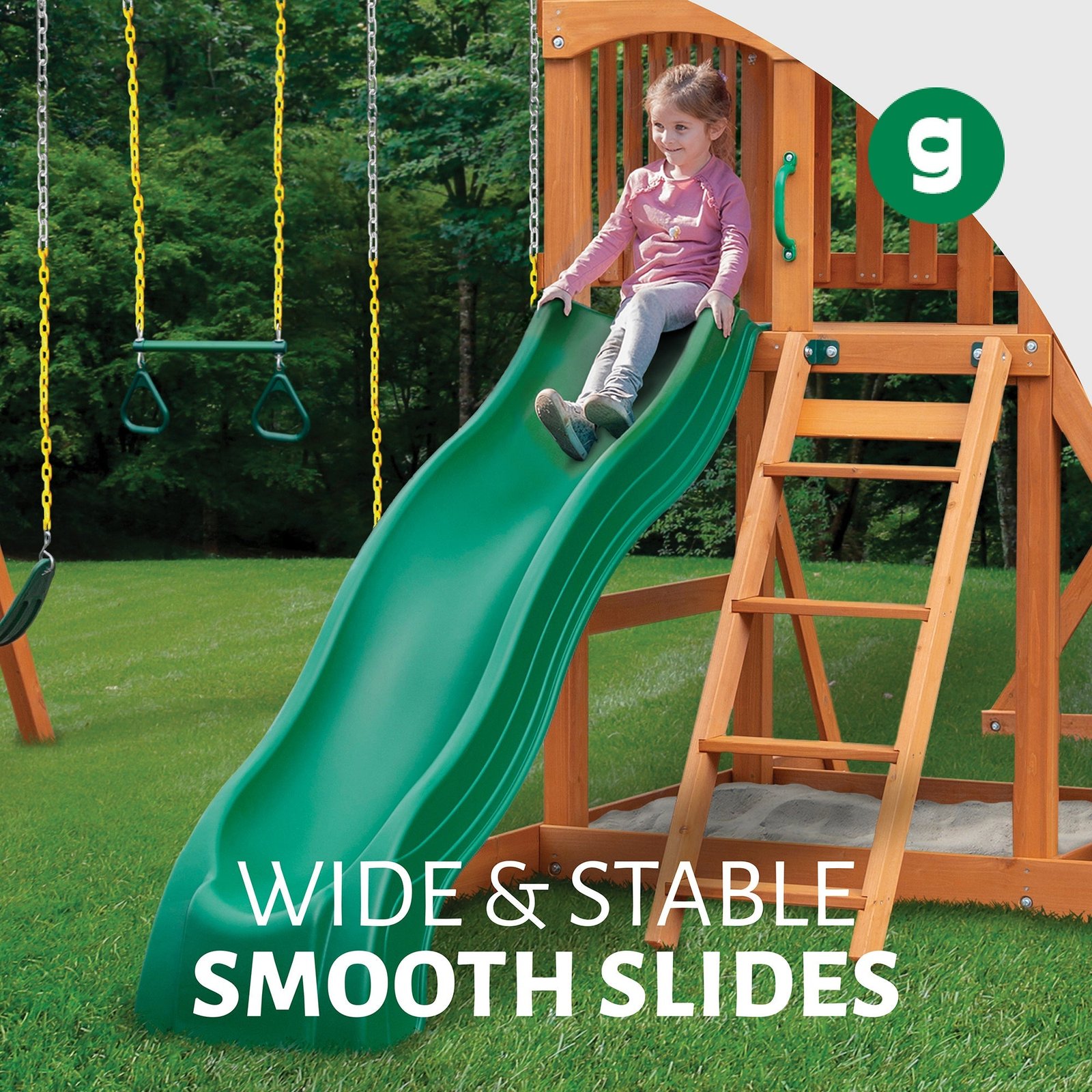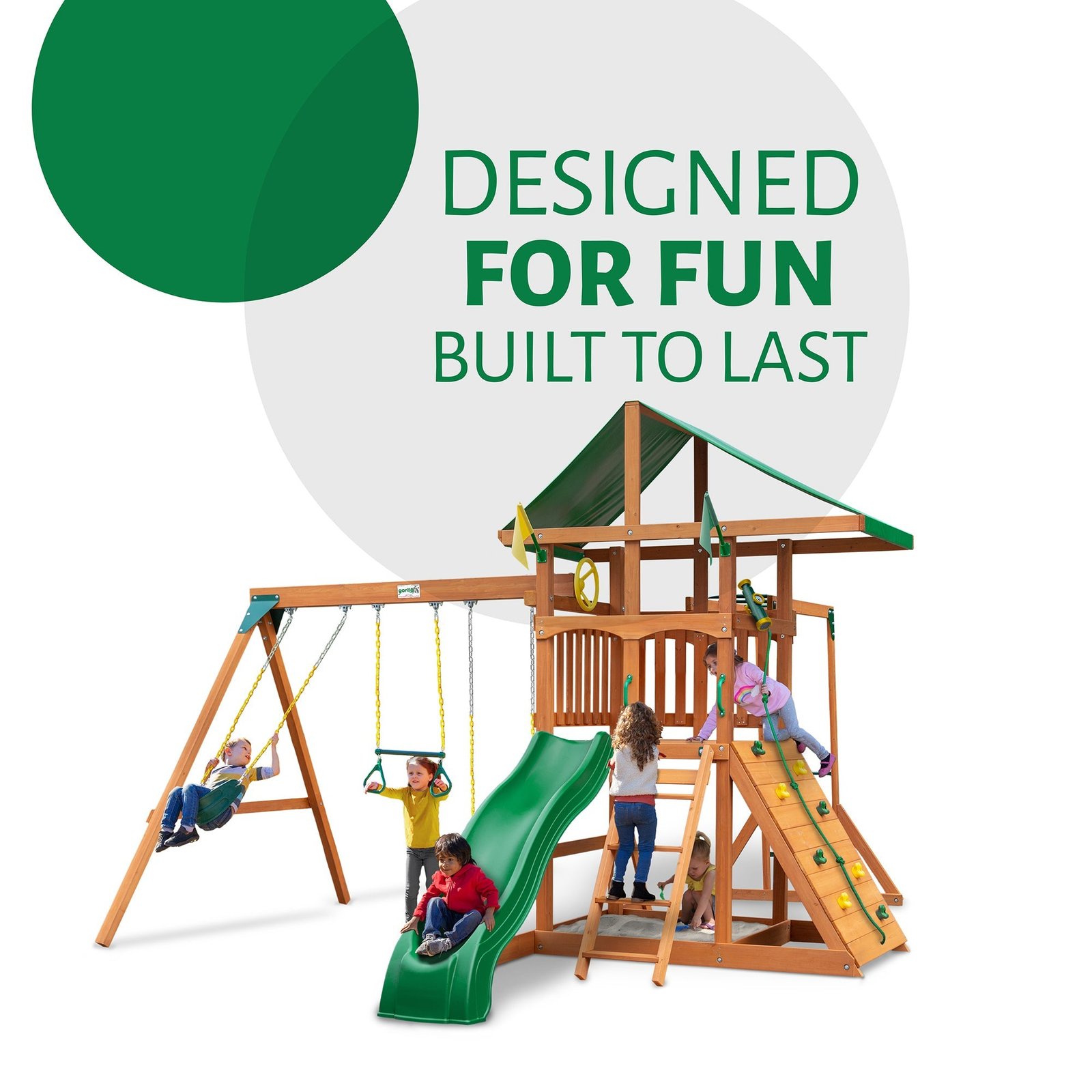 Ensure a great time for your kids when you have the Gorilla Playsets Outing Swing Set in the yard! There are all kinds of fun things for your kids to do. They can spend hours on the Alpine Wave slide, built in sandbox area or the rock wall. Playing outside will become their favorite pastime. Order yours today!