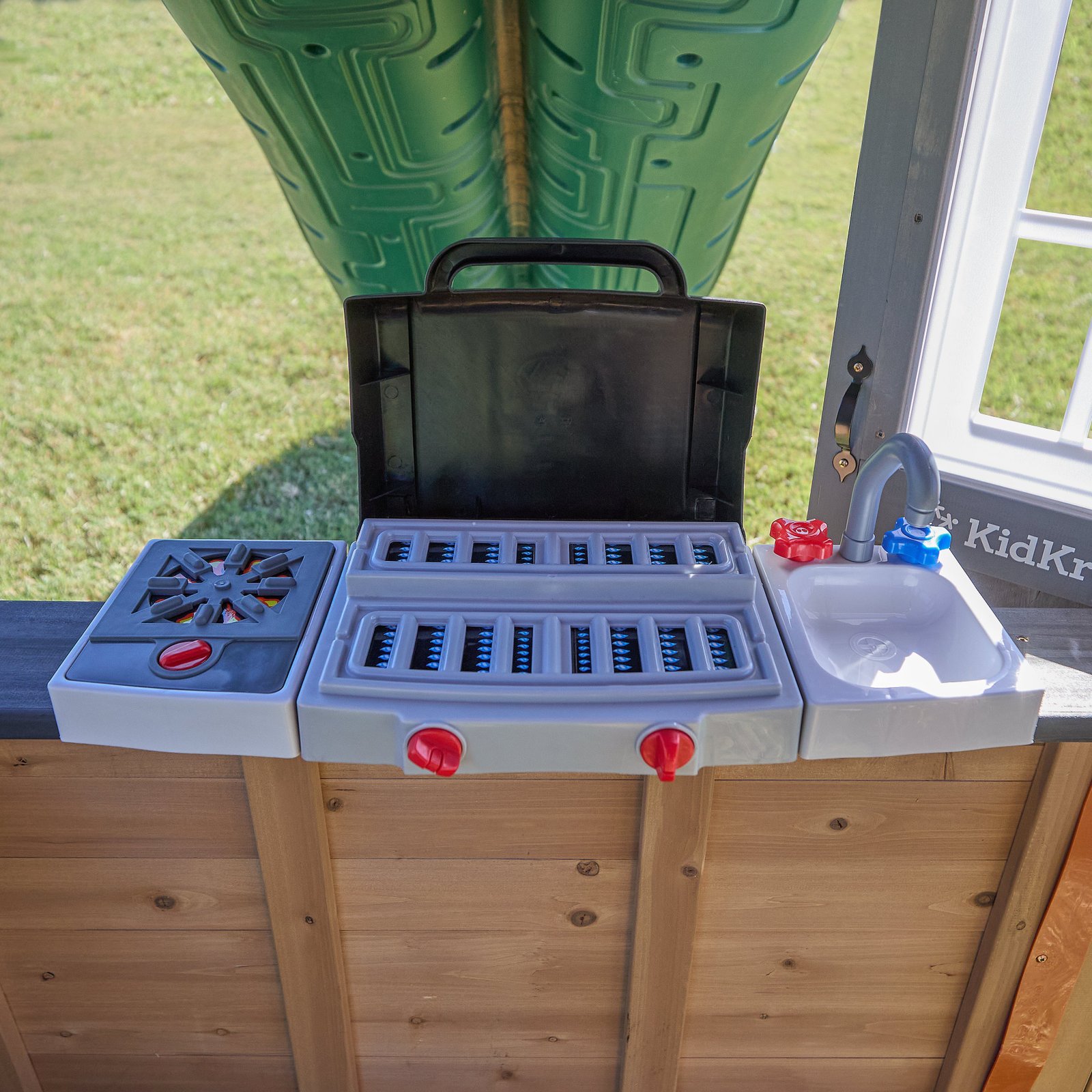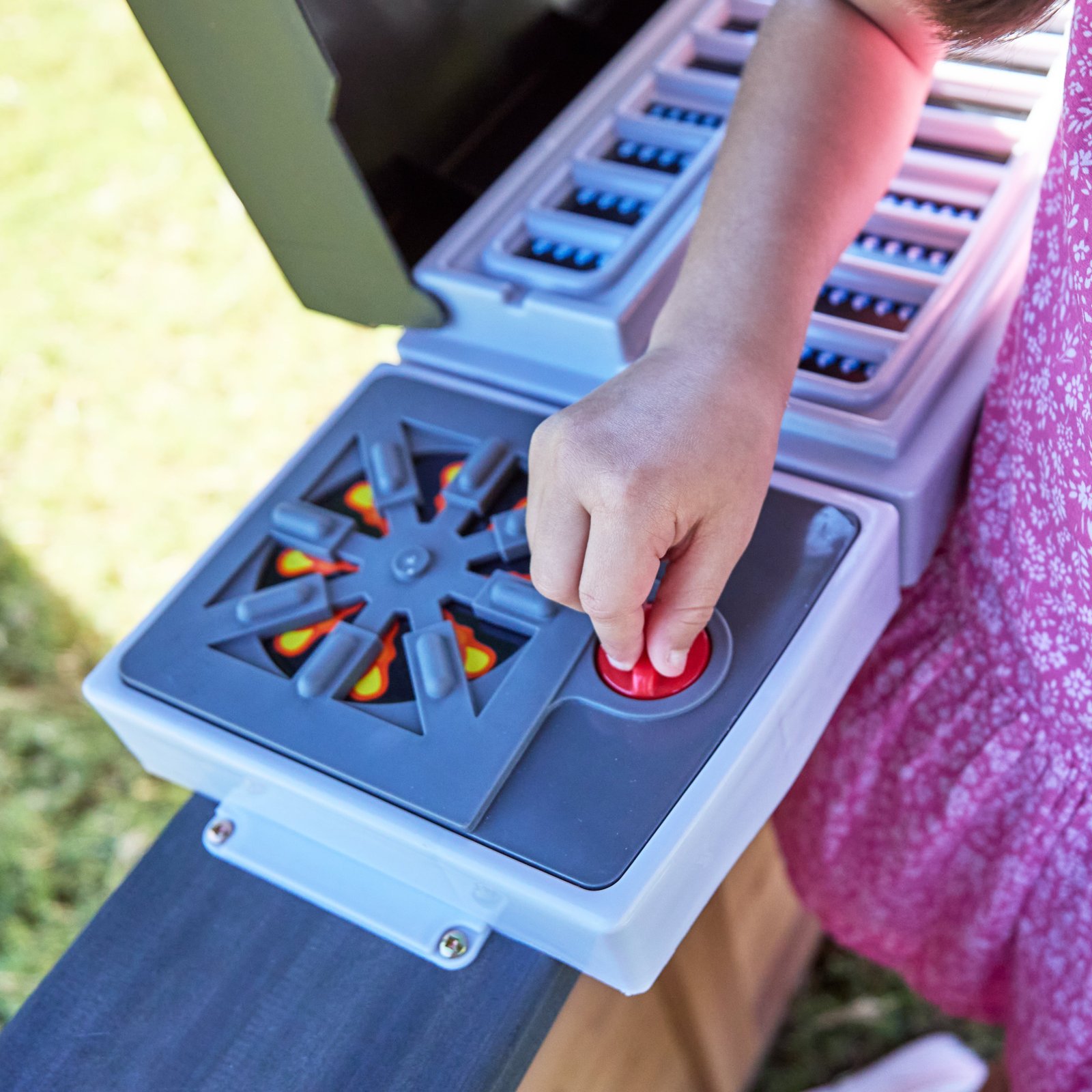 - Kitchen with sink, burner and grill with knobs that turn and fire-inspired graphics that magically appear
