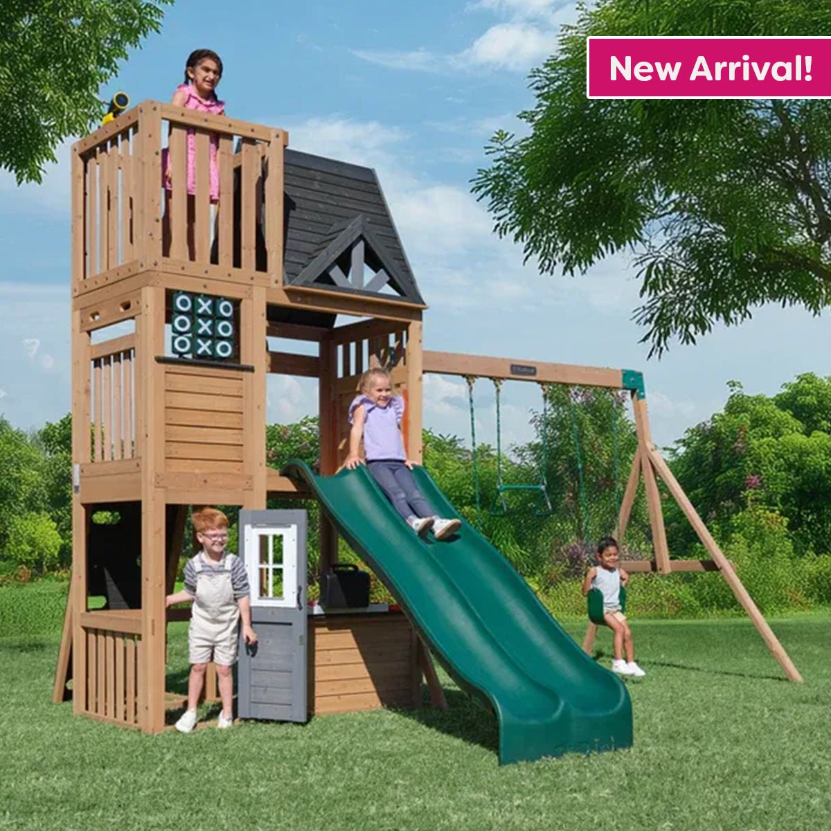 Big fun starts at the top with the KidKraft Parkwood Post Swing Set, a three-story wooden playset crowned by a crow’s nest at the very top. Built to entertain up to nine kids at a time, this backyard destination is packed with activities that keep the play going all day. Imaginative fun begins on the lower level, where kids can cook up pretend meals in the full play kitchen featuring a sink, burner, and BBQ grill. The grill lid opens and closes, red and blue faucet knobs really turn, and the burner and grill knobs reveal flame graphics with a twist. A picnic basket stocked with play food, plus a pot, pan and spatula, makes every make-believe meal feel real.Kids can reach the second level via the rock wall and then choose to slide down the fireman’s pole or take a race down one of the wave slides. The shaded middle level, protected by a durable wood roof, offers a comfortable spot for games or snack breaks.At the top, the crow’s nest includes a telescope so kids can scout the next adventure. Of course, there’s the usual belt swings and acrobar so they can catch the breeze and tickle their tummies too. Who needs to go to a park when you have the long-lasting Parkwood Post Swing Set right in your own backyard?