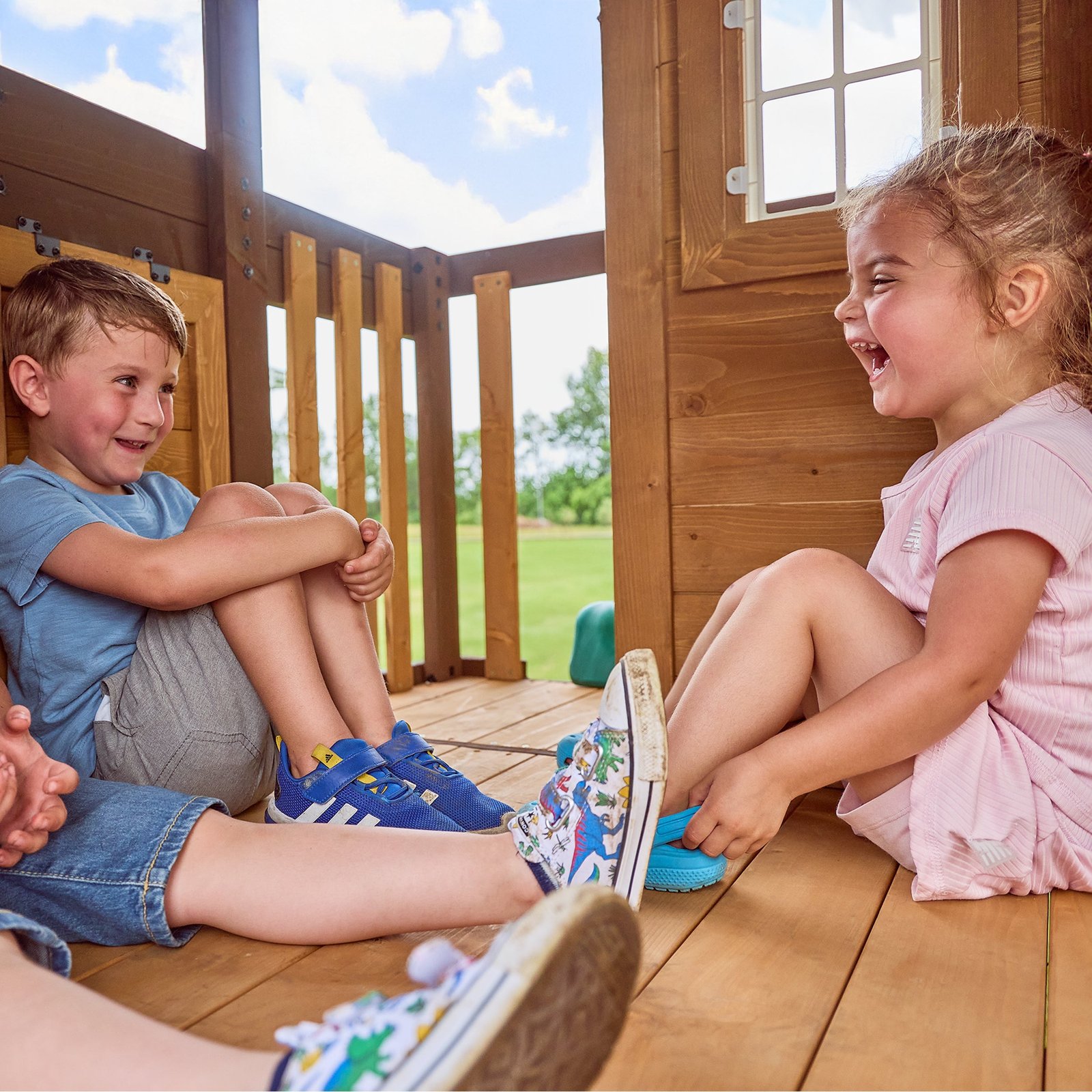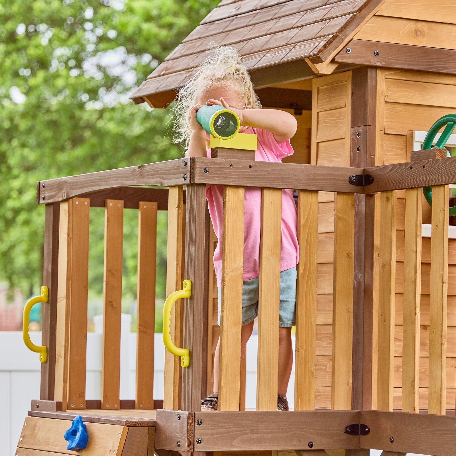 Kids can step into a world of adventure with the Spruce Hollow Swing Set by Backyard Discovery. Designed to grow with your family, this kids swing set features upper and lower play spaces that keep children of various ages engaged. The raised clubhouse is the ultimate hangout spot, complete with two balconies, a toy telescope, and steering wheel for planning the next big quest. From the clubhouse, kids can zoom down the 8-foot speedy wave slide before racing over to the two belt swings or trapeze bar for active fun. Reaching the clubhouse is part of the fun with multiple routes where children can climb the rock wall for a challenge or use the easy-access flat step ladder for a quick way up. Beneath the clubhouse, the playhouse inspires creativity with a play kitchen featuring a toy stovetop, sink, and play food for make-believe meals while the shaded picnic table with two benches is perfect for arts, crafts, or snack breaks. Crafted from durable spruce, this wooden swing set is finished in a warm light brown stain with dark trim accents for lasting beauty. Bring home the Spruce Hollow Swing Set and transform your backyard into a fun playground destination.