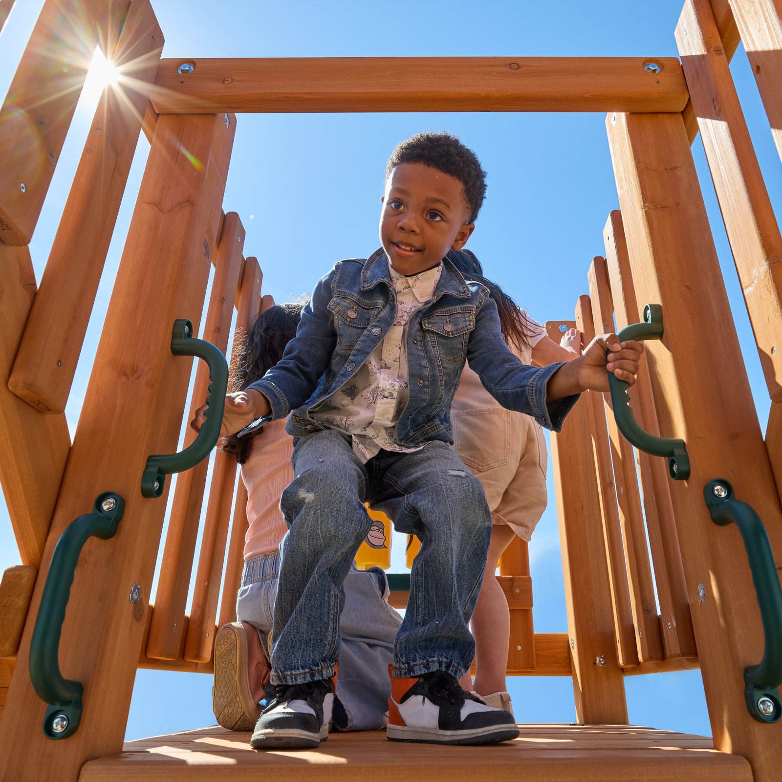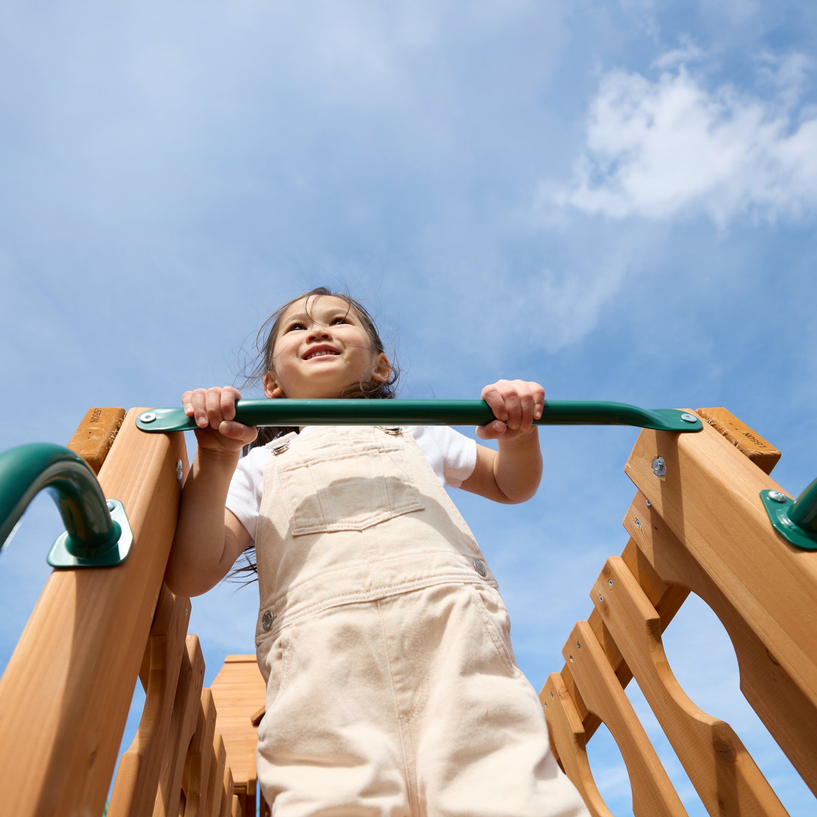 - Wooden slat ladder for a traditional way to climb up; safety handles at the top help even more