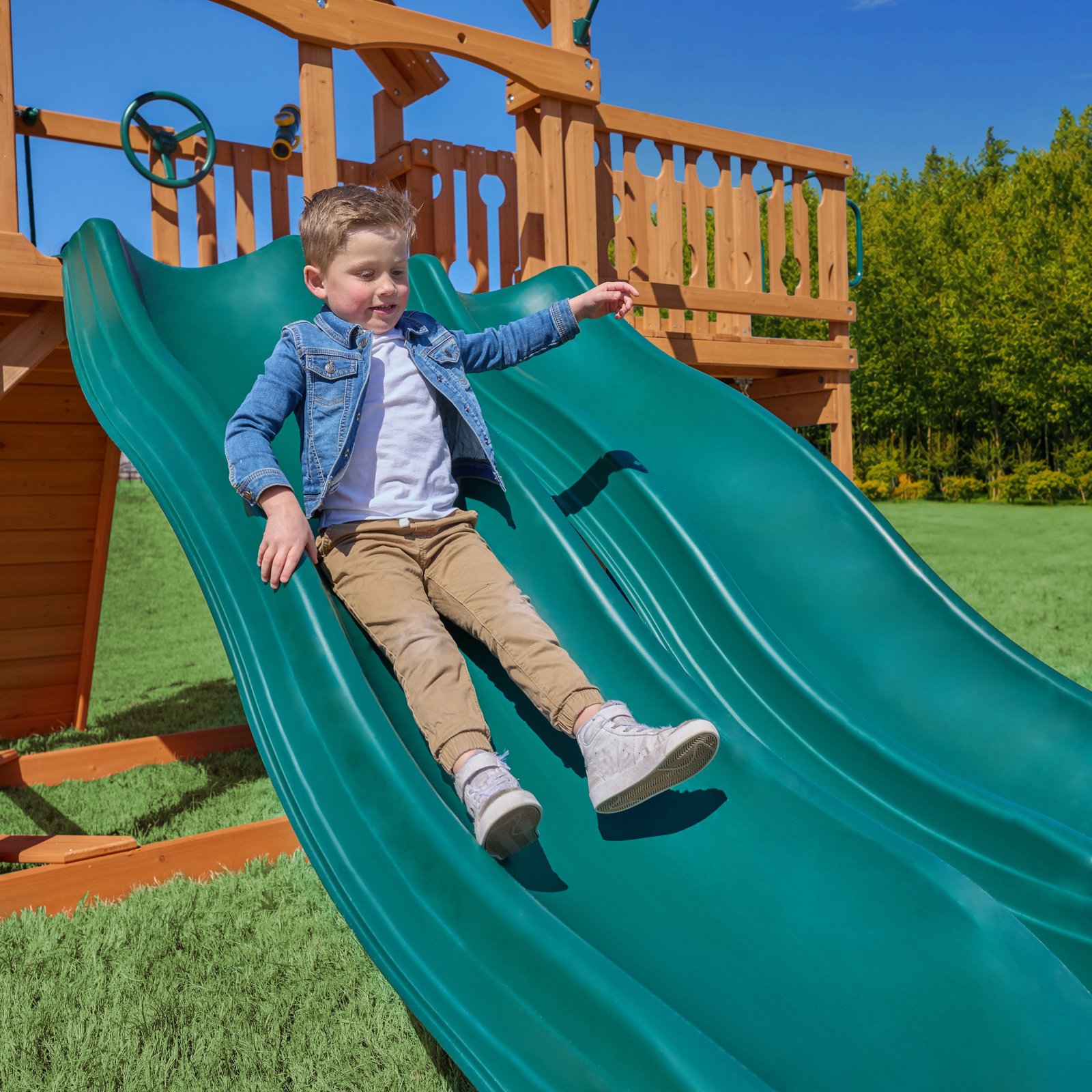 - Two Alpine Wave Slides with safer high-rail sides and sloped edge for gentler landings