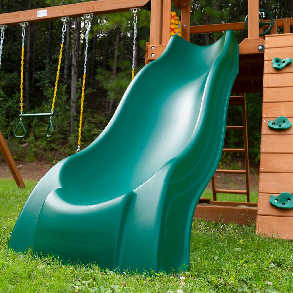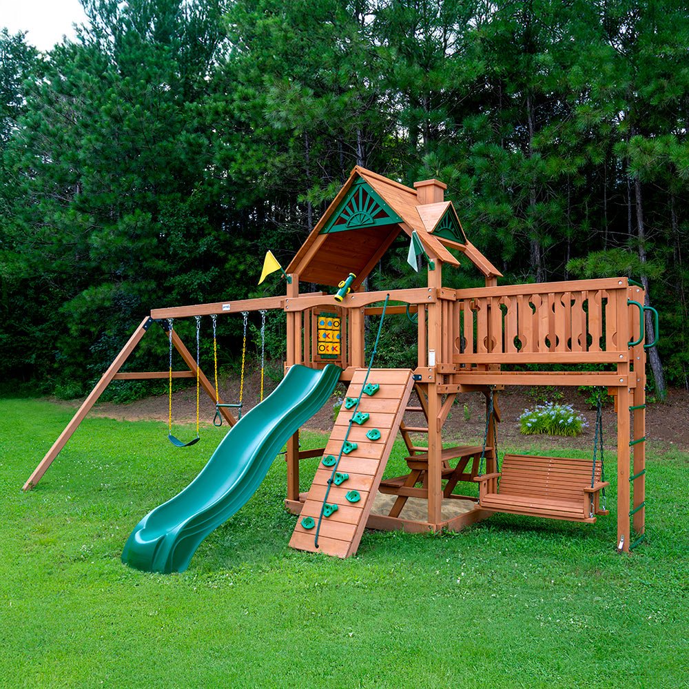 The Gorilla Playsets Summerville Swing Set is a place where both kids and adults can hang out and enjoy the backyard. This wooden playset has activities for little ones to play on while grownups can sit and relax in the hanging swing attached underneath. From the trio of swings to the rock wall and slide, there’s plenty of active play for a whole crew of kids. The second-level fort is covered with a durable wooden roof (featuring a cozy chimney accent) to keep imaginative play shaded during sunny days. There’s a tic-tac-toe game board plus a telescope, steering wheel and flags for role playing all sorts of adventures. The walkway with a decorative cut-out pattern on the safety rails gives this outdoor swing set a homey vibe that will inspire more storytelling play. Provide a backyard destination the whole family will look forward to with the Gorilla Summerville Wooden Swing Set.