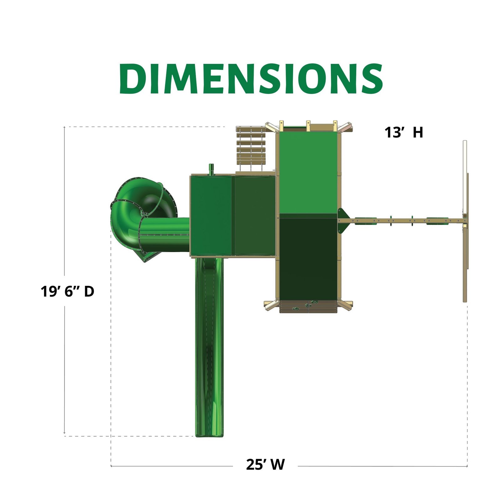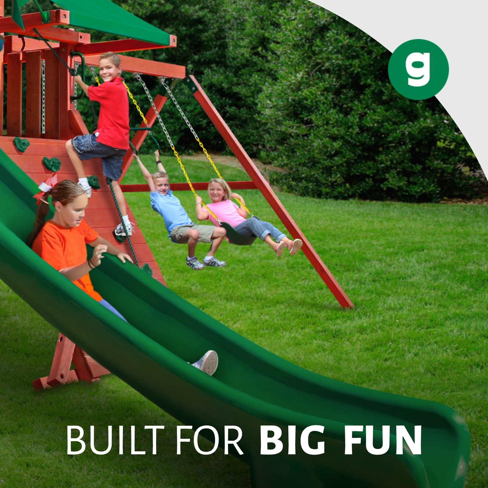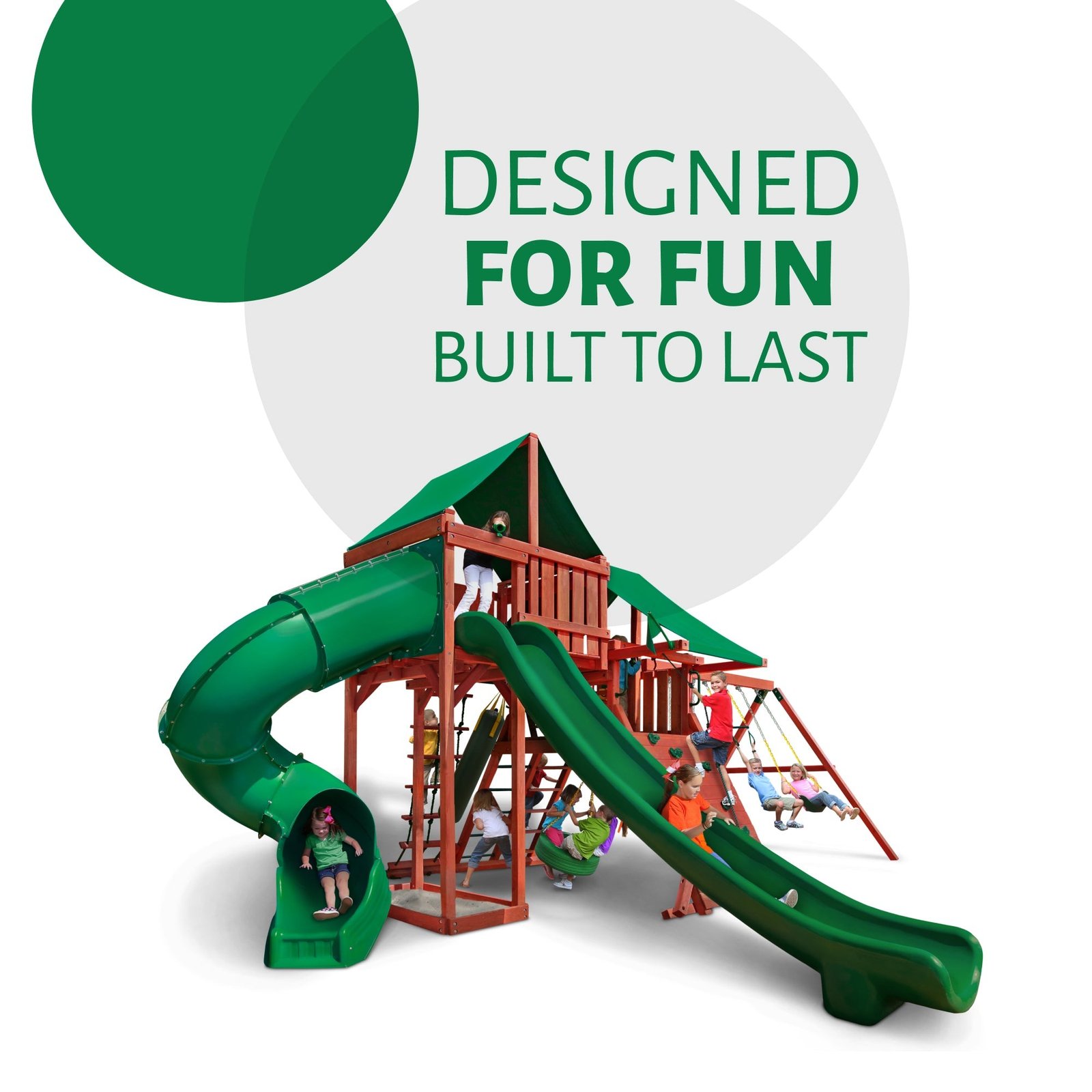 The Sun Valley Deluxe by Gorilla Playsets is the ultimate outdoor wooden swing set, offering three exciting levels for kids to explore. On the ground level, they can dig in the sandbox, spin on the 360° Turbo Tire Swing™, or punch away at the included punching bag. The second level features a fun Steering Wheel and a built-in tic-tac-toe game for interactive play. For thrilling slides, kids can zoom down either the massive 14′ Super Scoop Slide™ or the exciting Radical Ride 7′ Tube Slide™. The play deck is topped off with a durable Green Vinyl Roof for weather protection. Get ready for hours of backyard fun—order your Sun Valley Deluxe swing set today!