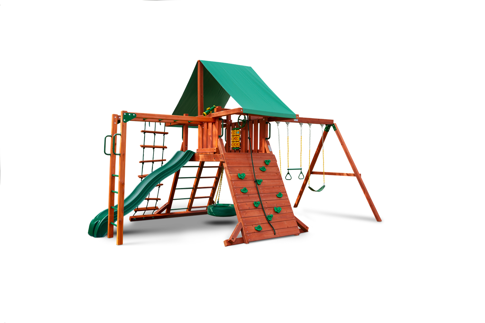 The Gorilla Playsets Sun Valley I Swing Set has a little something to please everyone. There are three types of swings: traditional belt swings, a trapeze swing and a tire swing. There is a rock wall and rope ladder for climbing. Once on the upper deck the children can slide down on the Alpine Wave Slide™. The set also includes several accessories like the tic-tac-toe panel, steering wheel and telescope. There are safety handles so the smaller children can use the set as well. Let the fun begin, order yours today!
