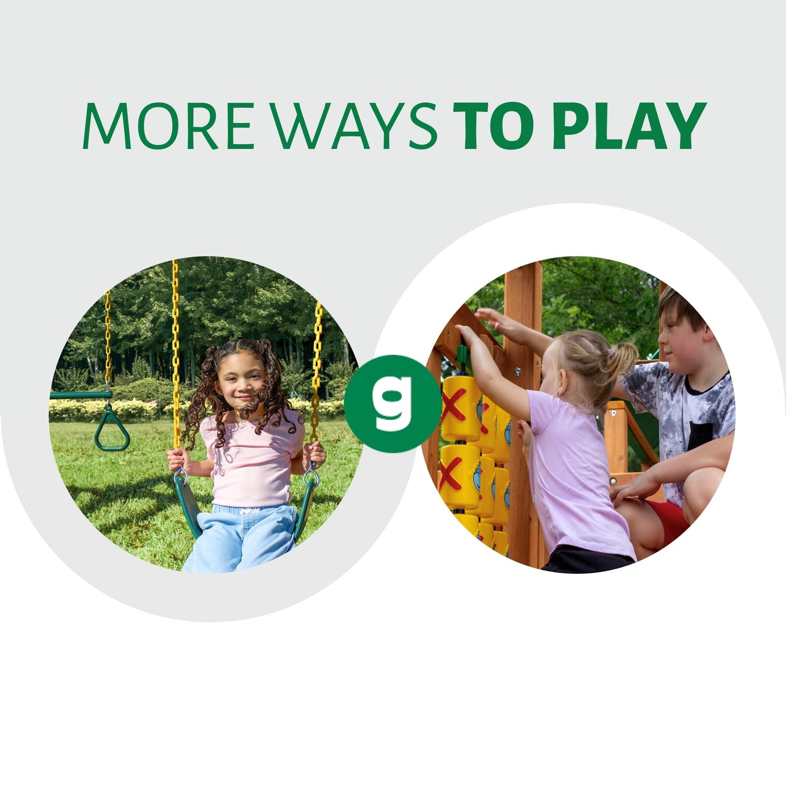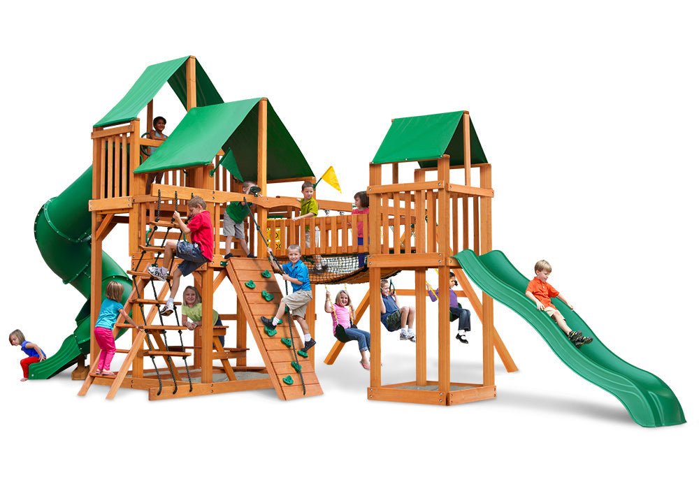 Kids will have a terrific time with the Gorilla Playsets Treasure Trove Swing Set w/ sitting in the yard. Throw in some accessories like the rock wall, the sandboxes and the Radical Ride 7′ Tube Slide™ for even more fun times. They’ll never be bored with this one. The main beams and posts are available Natural Cedar. Order yours today!