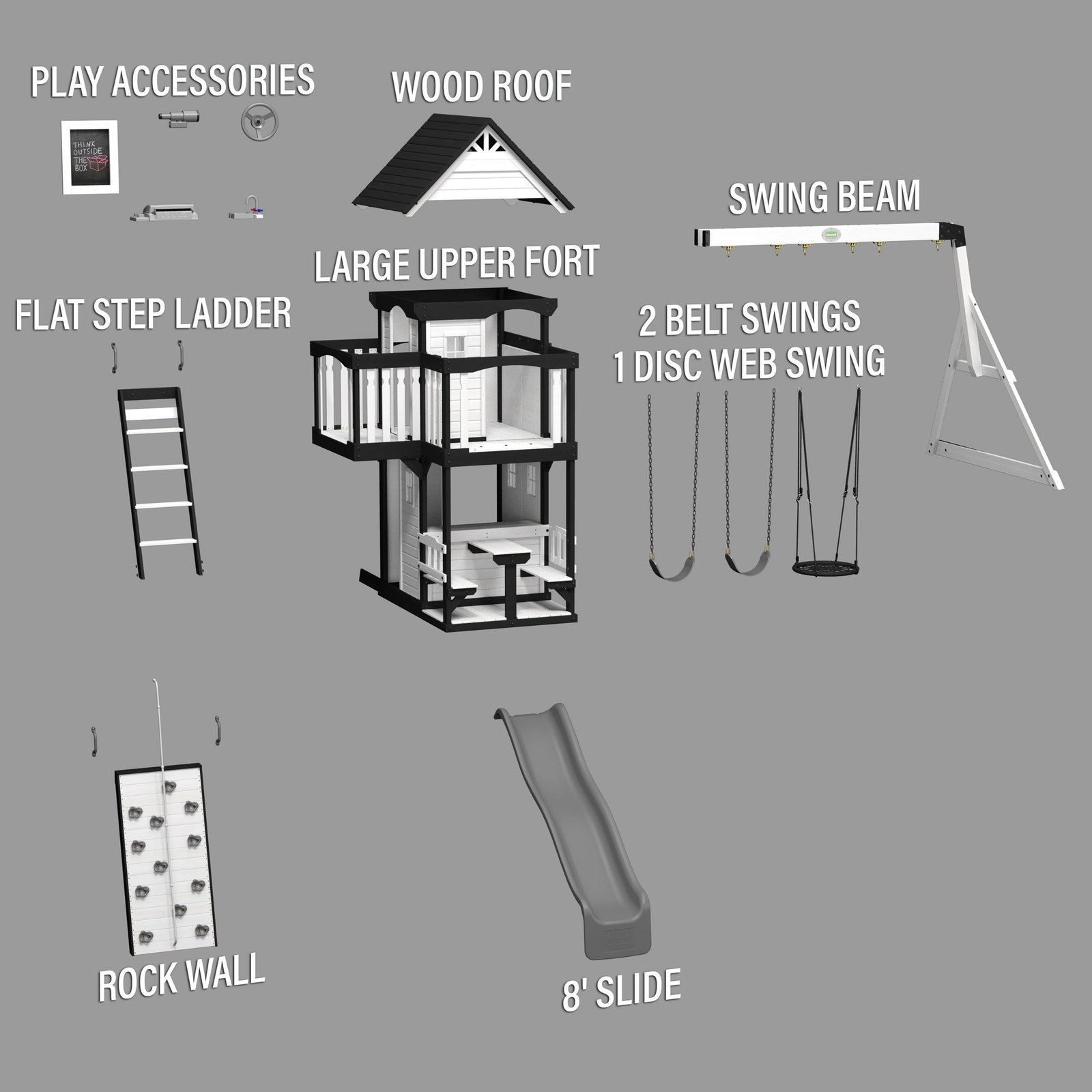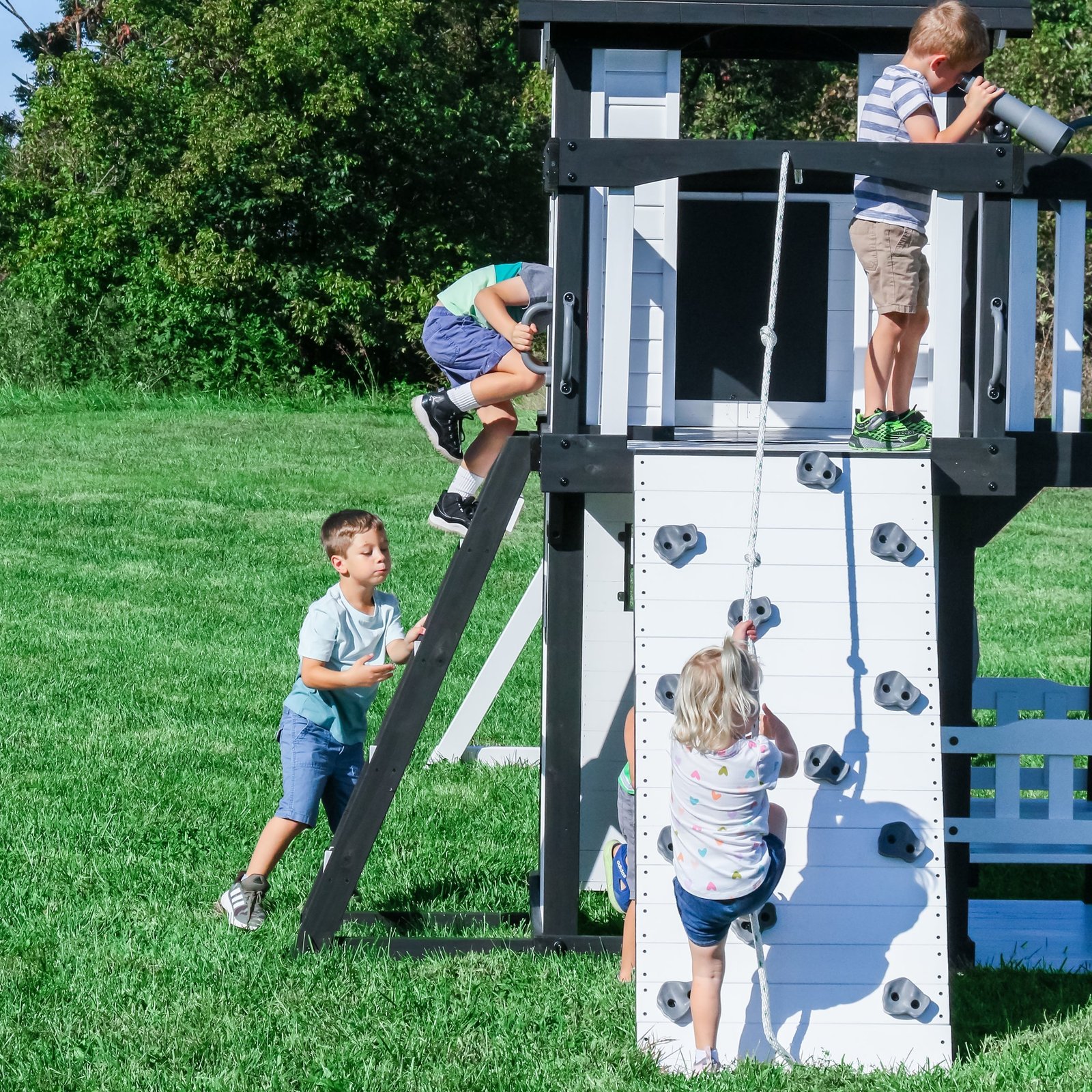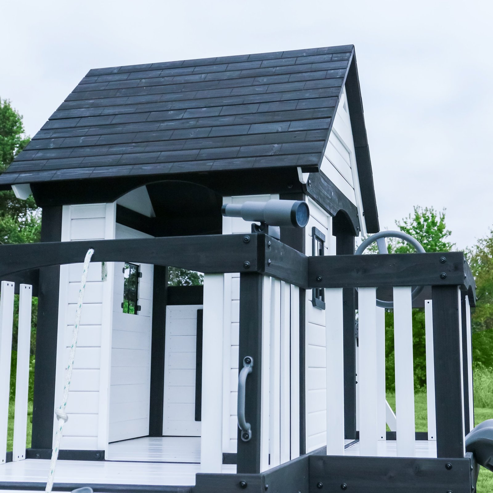 - Elevated Adventure: Raised clubhouse with two balconies, a wooden roof, steering wheel, toy telescope, and chalkboard is perfect for outdoor play