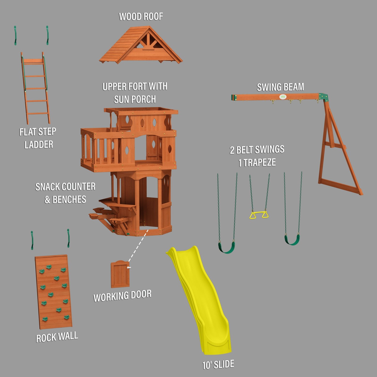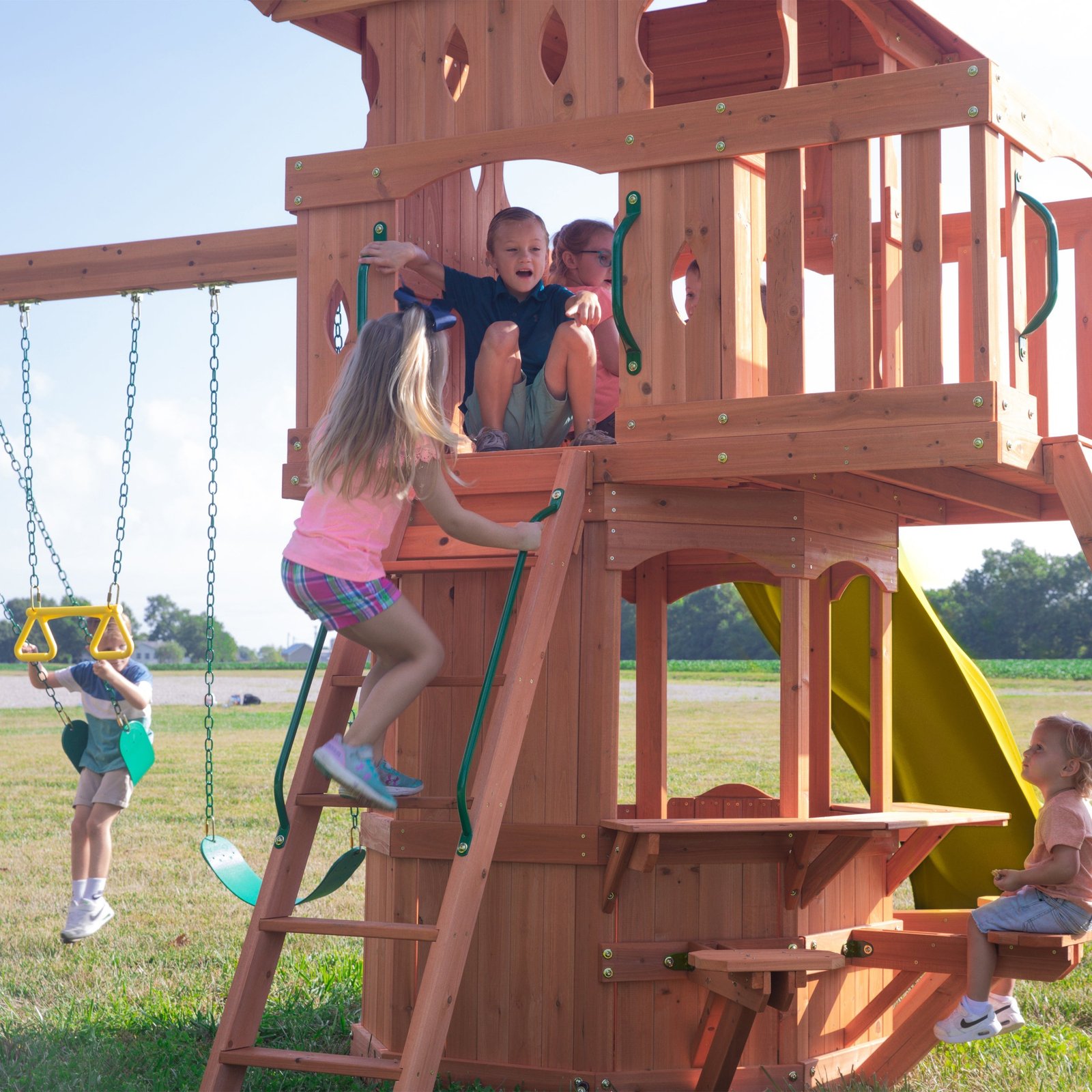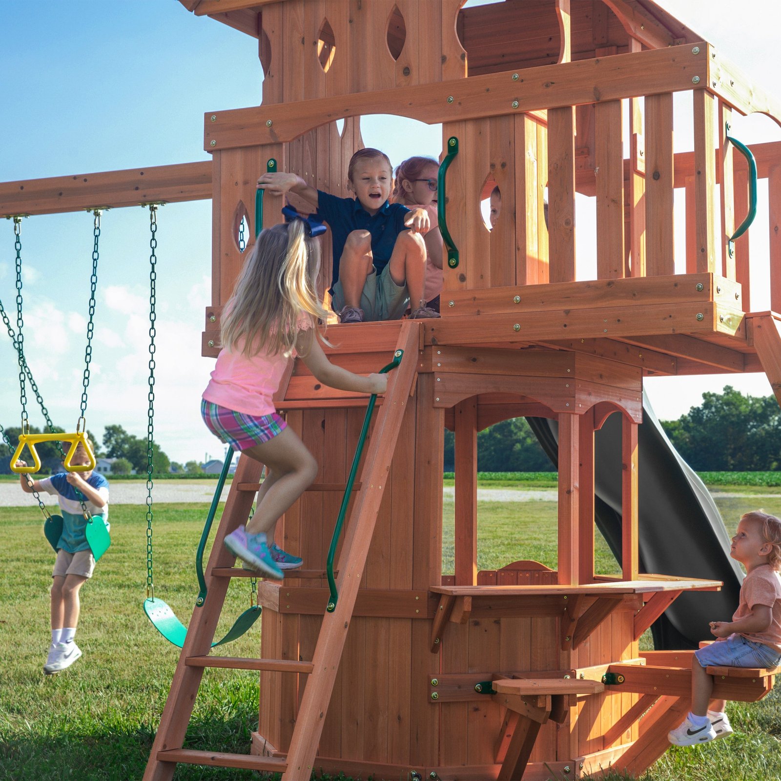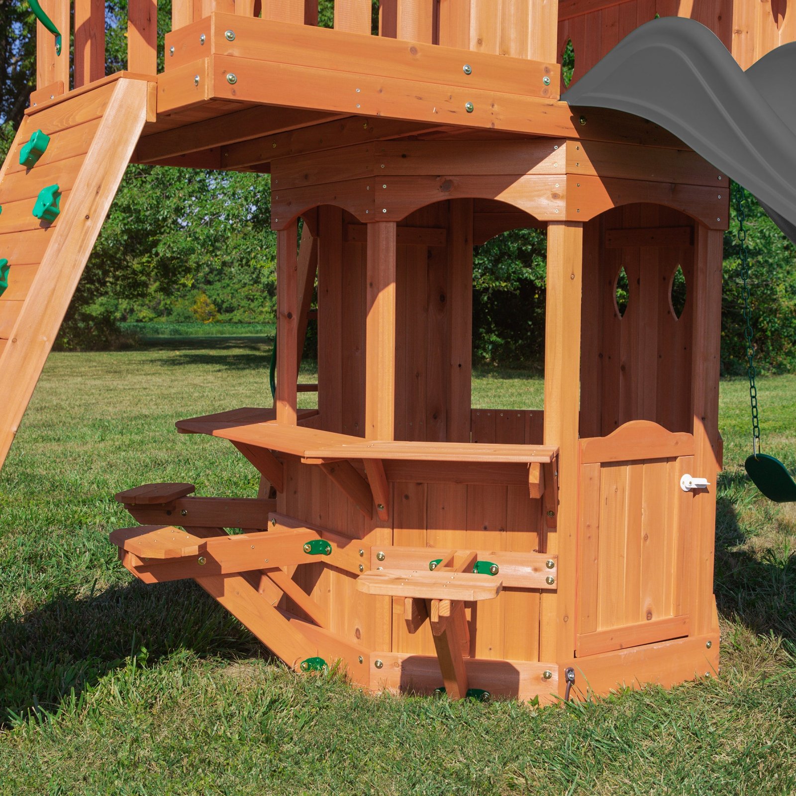 Enjoy the enchanting charm of a forest cottage with Backyard Discovery’s Woodland Swing Set, where magical outdoor adventures come to life. The beautiful upper clubhouse features a peak roof and whimsical diamond-shaped peepholes that create a storybook hideaway inspiring imaginations. Little explorers will love scaling the daring rock wall that challenges their climbing skills or taking the kid-friendly flat step ladder for easier accessibility. Beneath the clubhouse, an octagon-shaped play space captures the essence of a fairy tale playset. An adorable half door opens to a snack bar serving station featuring three built-in seats, transforming into a cozy café where friends gather for snack time or arts and crafts. Kids can zoom down the 10-foot speedy wave slide from the clubhouse and race to the two classic belt swings for sky-high adventures. Aspiring gymnasts will delight in practicing acrobatic skills on the trapeze, adding an extra layer of fun to playtime. Crafted from naturally durable cedar, this premium wooden swing set ensures exceptional strength and resistance to weather, providing a play structure that will withstand countless childhood adventures. It’s ready to assemble and offers BILT® app guidance, promising to create a magical backyard playground where childhood memories bloom like wildflowers.